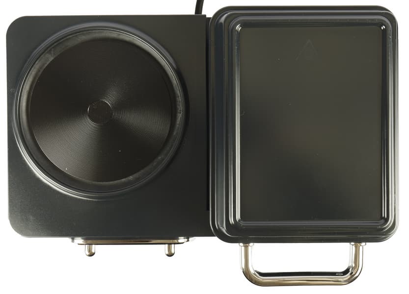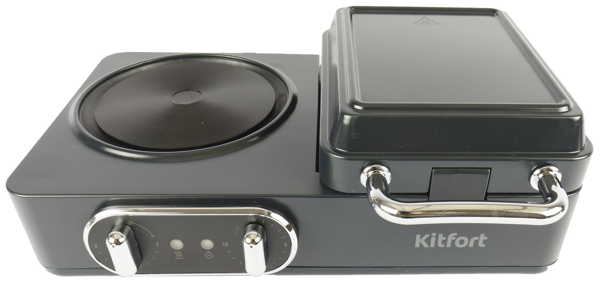 Слева в основание встроен ребристый диск конфорки диаметром 13,5 см, справа — гриль, тоже встроенный, с тэнами в верхней и нижней панелях.