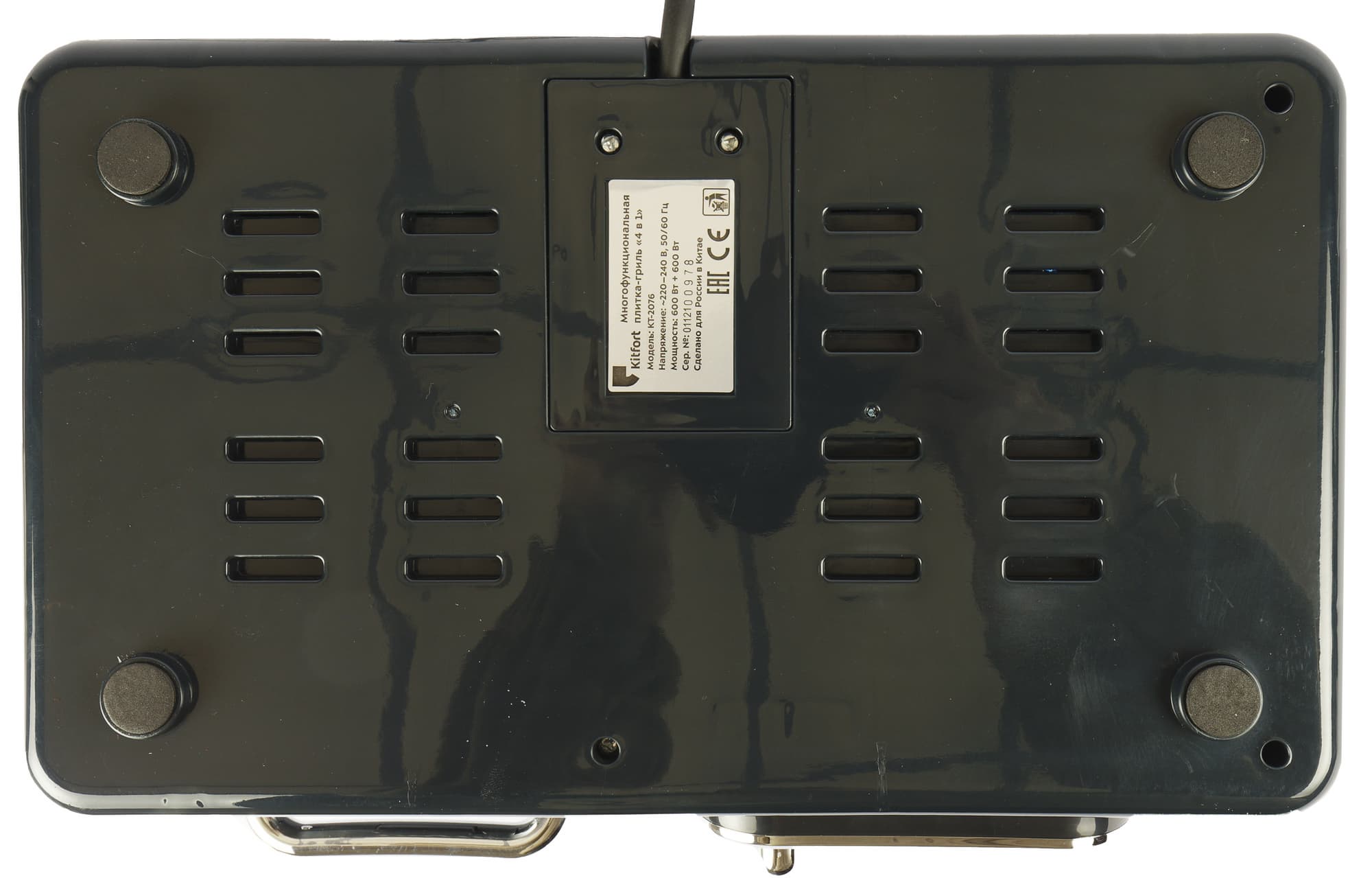 На дне прибора — вентиляционные прорези, наклейка с технической информацией и 4 ножки с мягким покрытием из вспененного полимера. С тыльной стороны выходит шнур электропитания длиной 0,7 м.