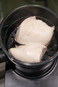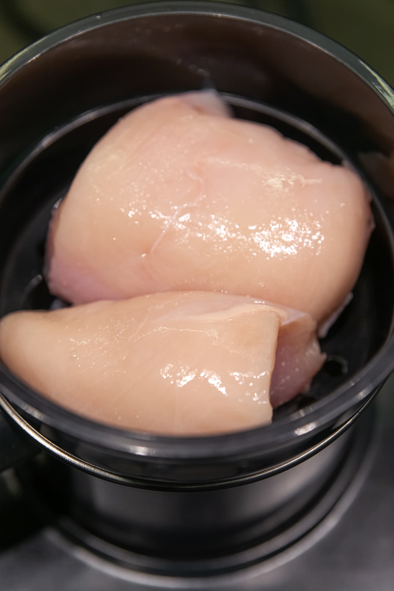 Поместили в кастрюлю 250 г промытой гречневой крупы, залили холодной водой 1:2, посолили и поставили закипать, повернув ручку регулятора на максимум. Сверху поставили пароварку с разрезанным на две части куском куриного филе общим весом 350 г и накрыли крышкой.