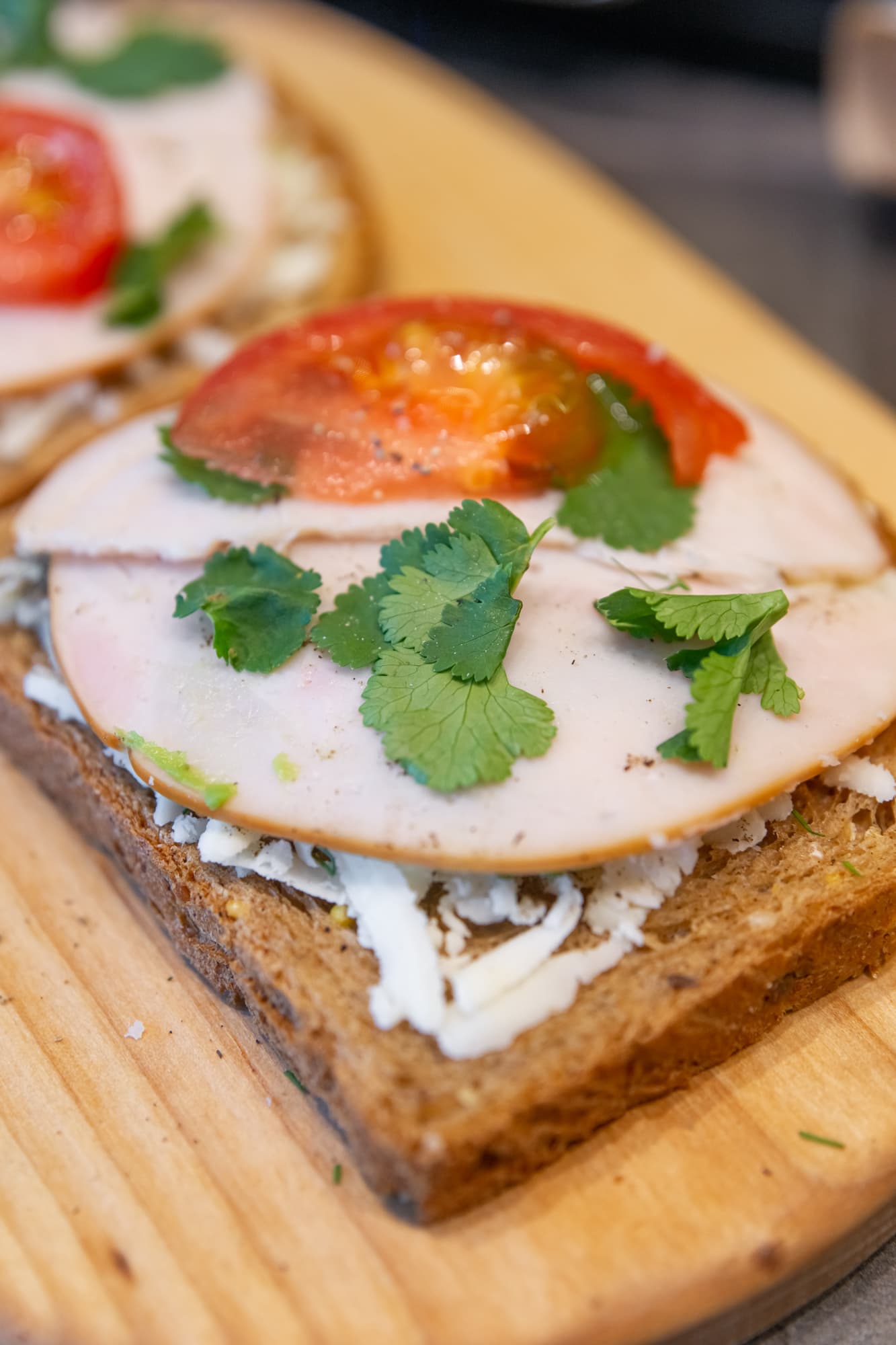 На хлеб, подходящий по размеру для панели гриля, мы слоями положили тертый сыр, кусочек авокадо, подсыпали зелени, черного перца, сверху разместили дольку помидора, копчено-вареное филе курицы и снова присыпали сыром.