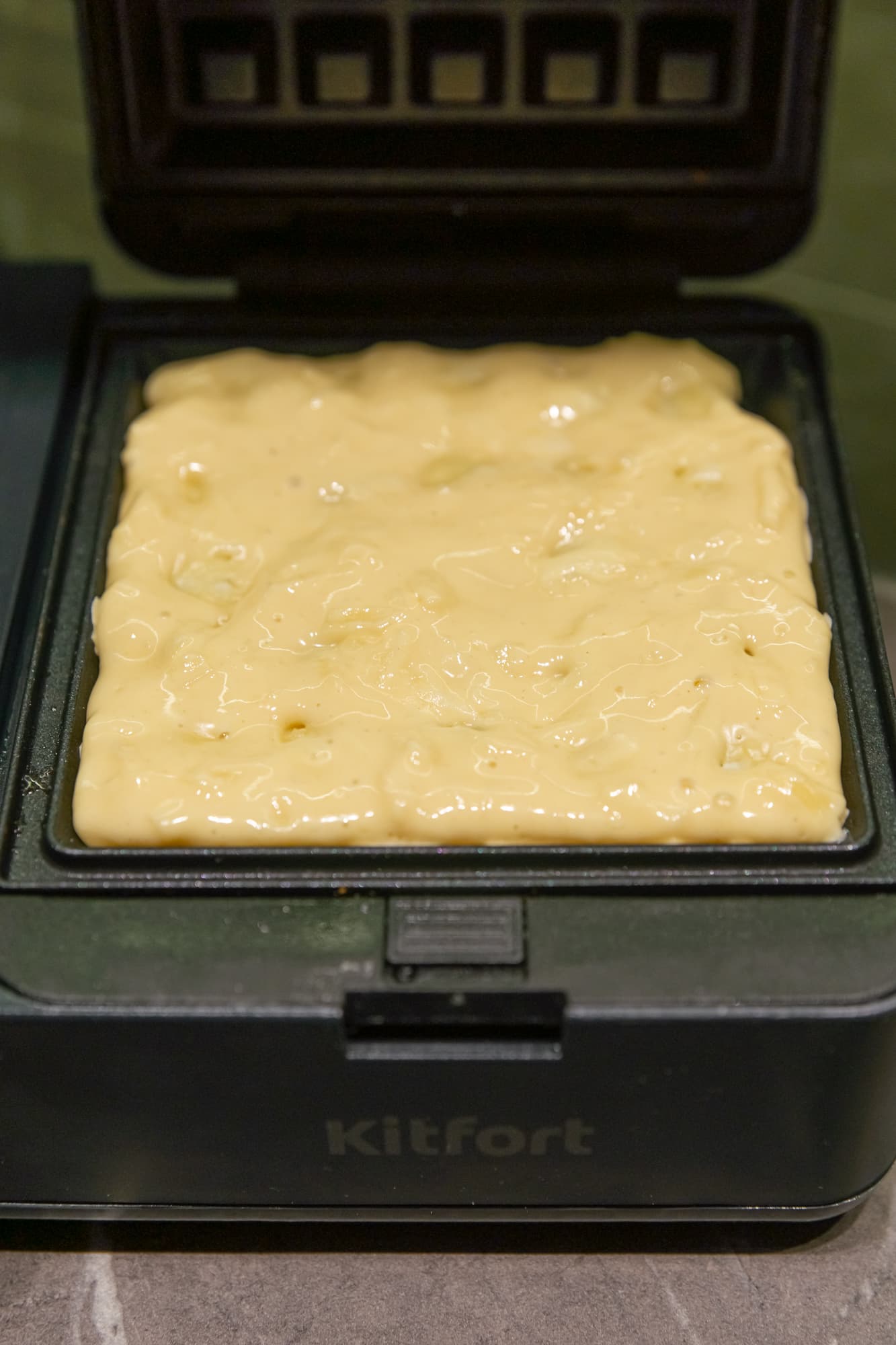 Разровняли и закрыли крышкой. Через 4 минуты открыли крышку полюбопытствовать. Тесто к тому времени уже схватилось и не прилипало к верхней панели. Закрыли крышку и подождали еще пару минут. В общей сложности на одну вафлю уходит порядка 6-8 минут. Верхняя часть получается чуть менее румяной, но разница не критична.
