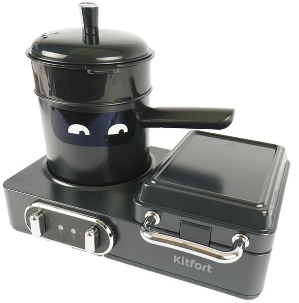 Первое впечатление, при взгляде на плитку — перед нами посуда из игрушечного набора. Kitfort КТ-2076 имеет весьма скромные габариты и небольшой вес, всего 3,3 кг. В длину основание плитки составляет 31 см, глубина без учета выступающих ручек — 18 см, а высота — 7.