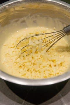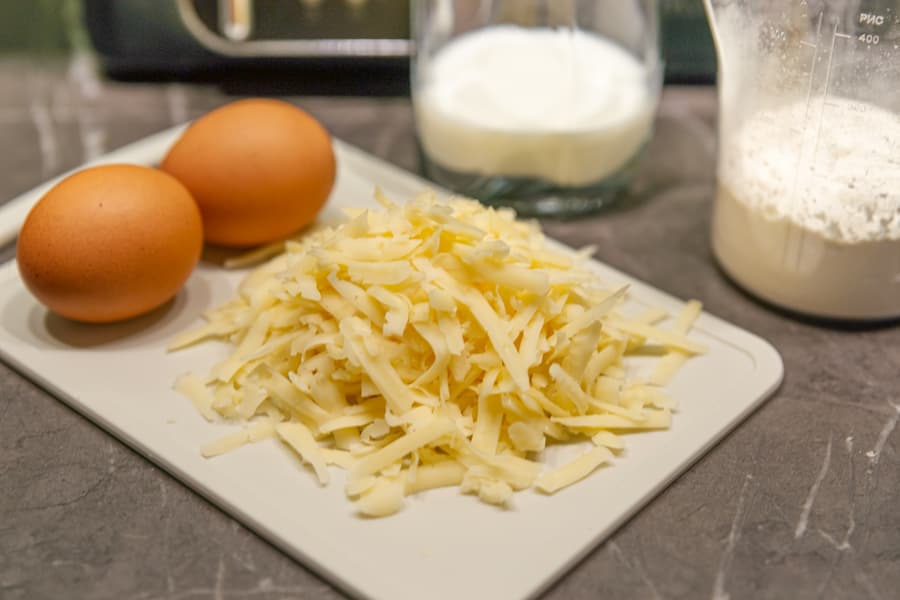 Смешали в миске 2 яйца и 50 мл молока. Потом туда же добавили щепотку соли, чайную ложку разрыхлителя и взбили венчиком до однородности и легких пузырьков. Добавили 100 г просеянной муки, 20 мл подсолнечного масла и еще раз хорошенько всё перемешали. Следом засыпали в емкость тертый сыр и снова перемешали. Разогретые панели смазали растительным маслом и выложили примерно две столовые ложки теста.