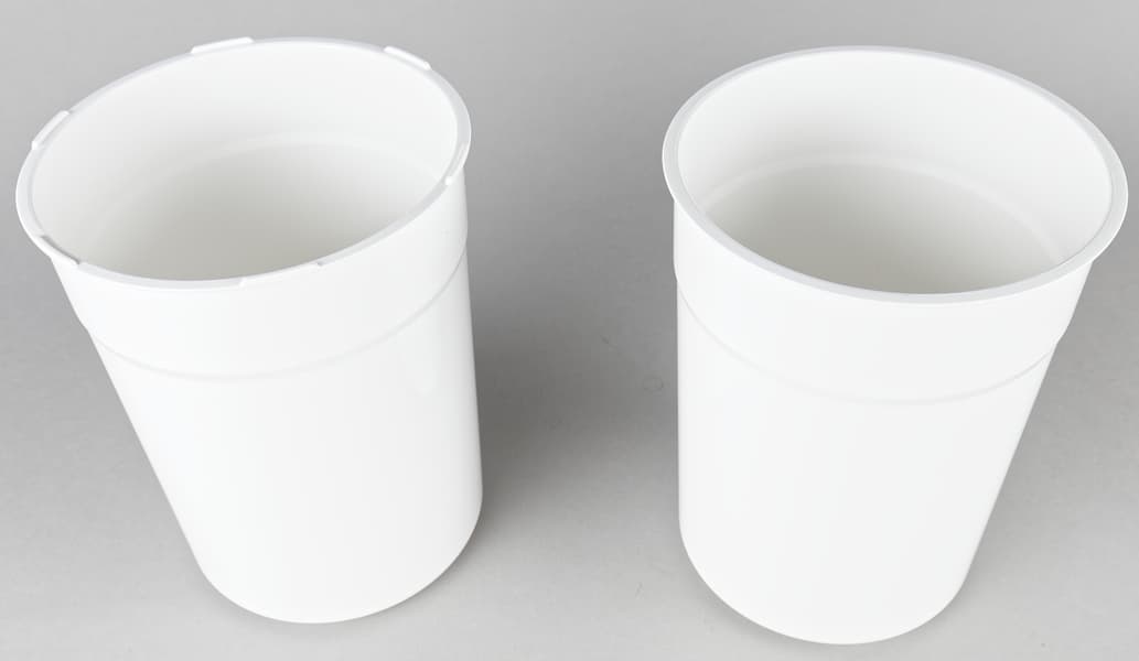 Стаканы сделаны из белого пластика. При хранении их можно вставить один в другой и поставить в корпус. Внутри последнего контейнеры никак не закрепляются. Оба чуть-чуть выше и уже внутренней емкости, а края немного утолщены, поэтому их удобно вынимать и ставить обратно — по крайней мере, пустыми.