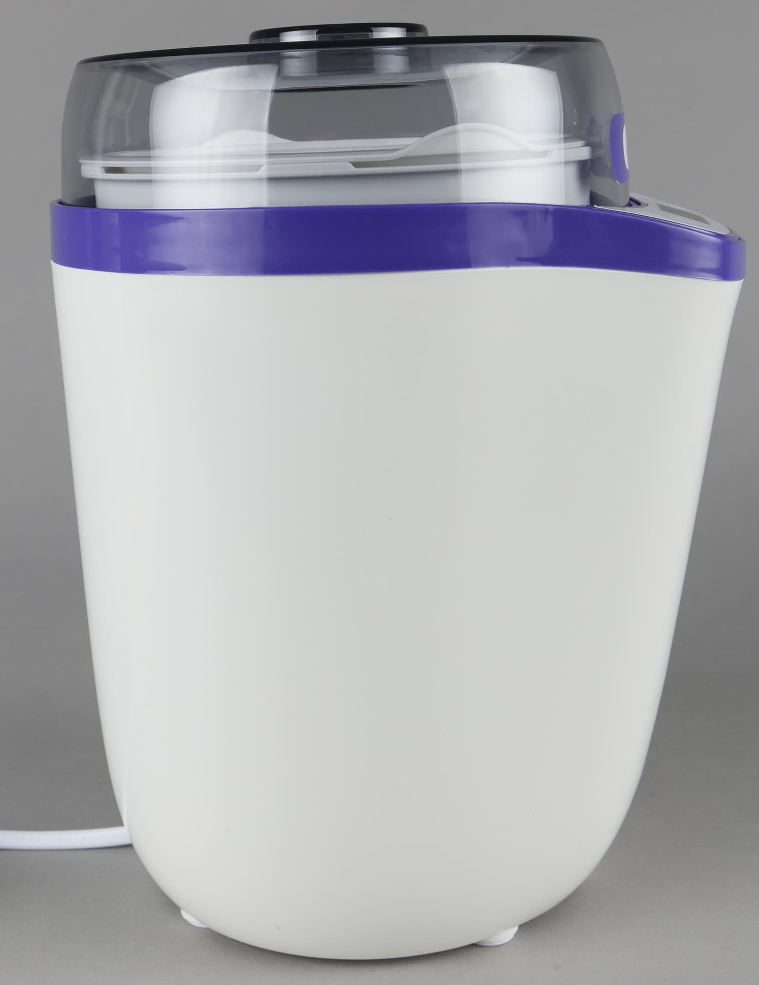Белый снаружи пластиковый корпус, украшенный фиолетовыми декоративным пояском, стремится к форме вертикального цилиндра. Поэтому прибор не займет много места на кухонной поверхности. Фиолетовая полоска окаймляет также выступ, на котором расположена панель управления.