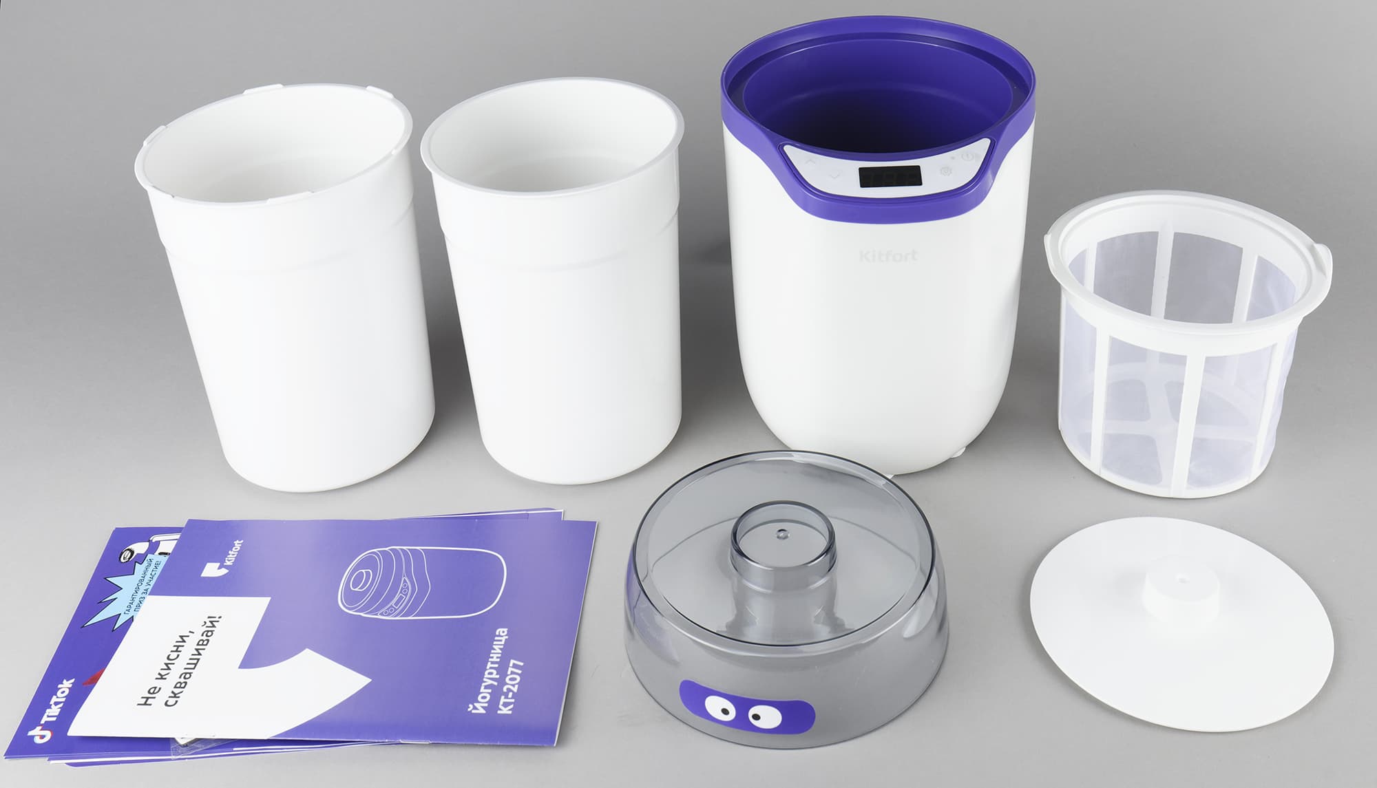 Йогуртница приехала нам в коробке, по которой сразу можно определить, кто ее произвел, — даже если заклеить название компании. Белые надписи на черном фоне, вставка фиолетового цвета и, конечно, креативный слоган на передней стороне сразу говорят нам: это прибор фирмы Kitfort.