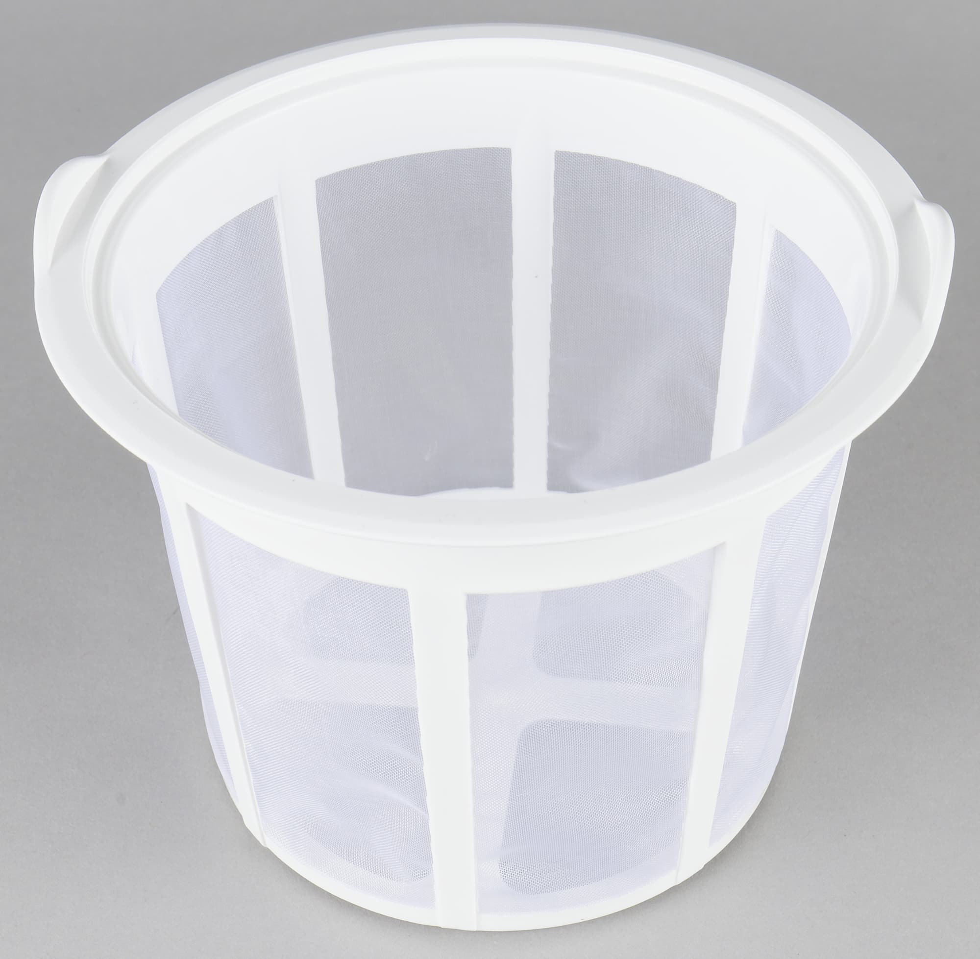 Белое сито сделано из мелкой полупрозрачной сетки — по всей видимости, полиамидовой — с пластиковыми ребрами жесткости. Его можно вставить в любой из стаканов. На верхнем ободе есть ушки, за которые его легко вытащить.