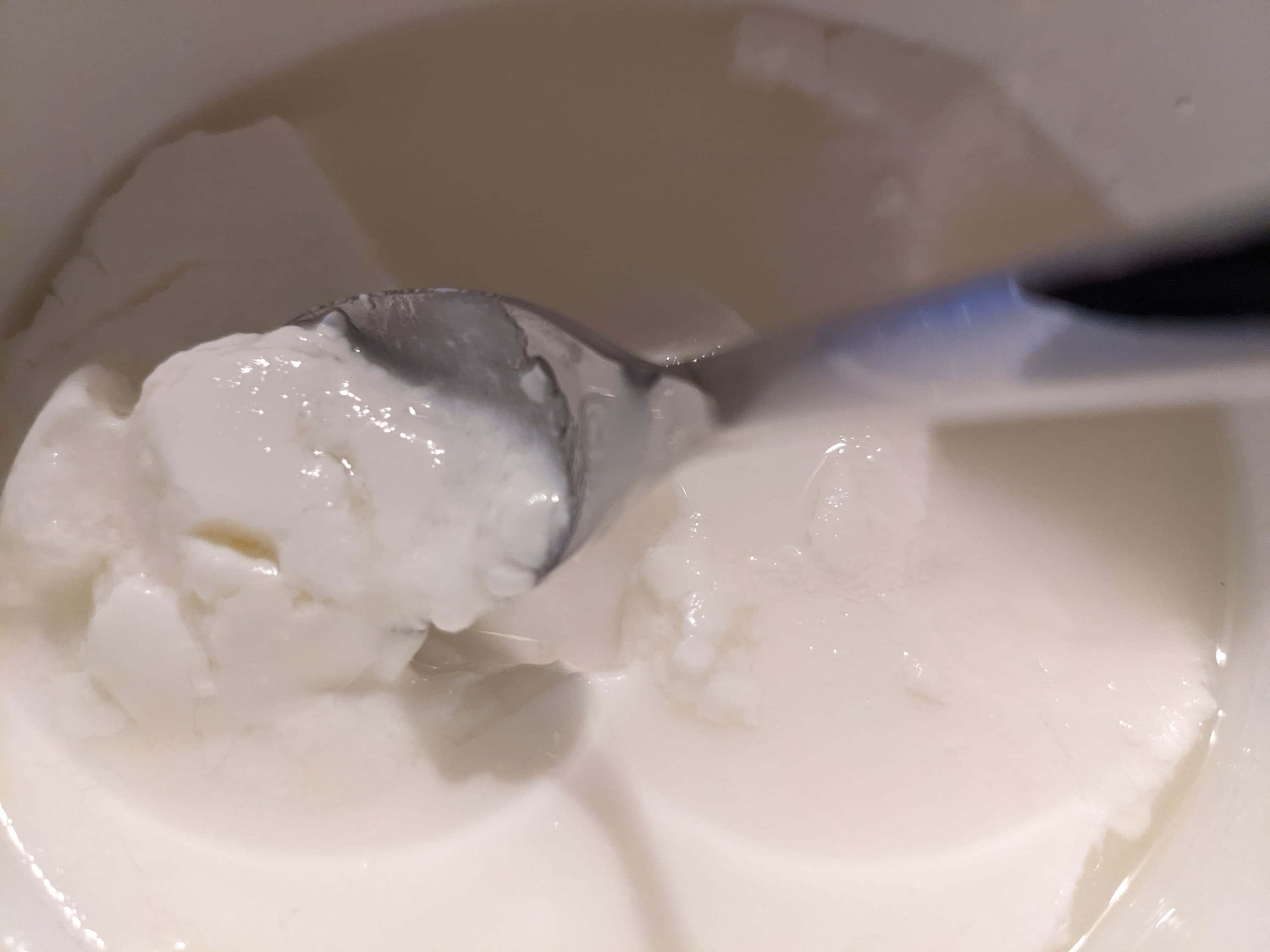 Из-за того, что молоко мы взяли пожирнее, в кефире у нас ложка если и не стояла, то очень медленно падала. Он получился плотный и густой — в самый раз для салатной заправки или прохладительного питья, если вы любите такую консистенцию. Но вот для холодного супа, пожалуй, нужно готовить более жидкий — для этого стоит взять менее жирное молоко или уменьшить время приготовления.