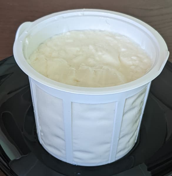 Из сита мы извлекли лепешку скорее даже не йогурта, а творога или творожного сыра толщиной около 4 см. Ее фактура оказалась нежной, но достаточно плотной. Она хорошо держит форму, ее можно резать ножом на кубики.