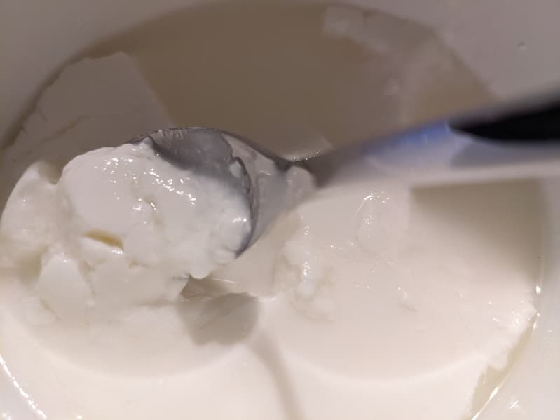 А вот йогурт, на наш вкус, чем гуще, тем лучше. Поэтому для следующего теста мы взяли пол-литра сливок 20-процентной жирности и закваску для йогурта, нагрели, перемешали и поставили на программу С-1.