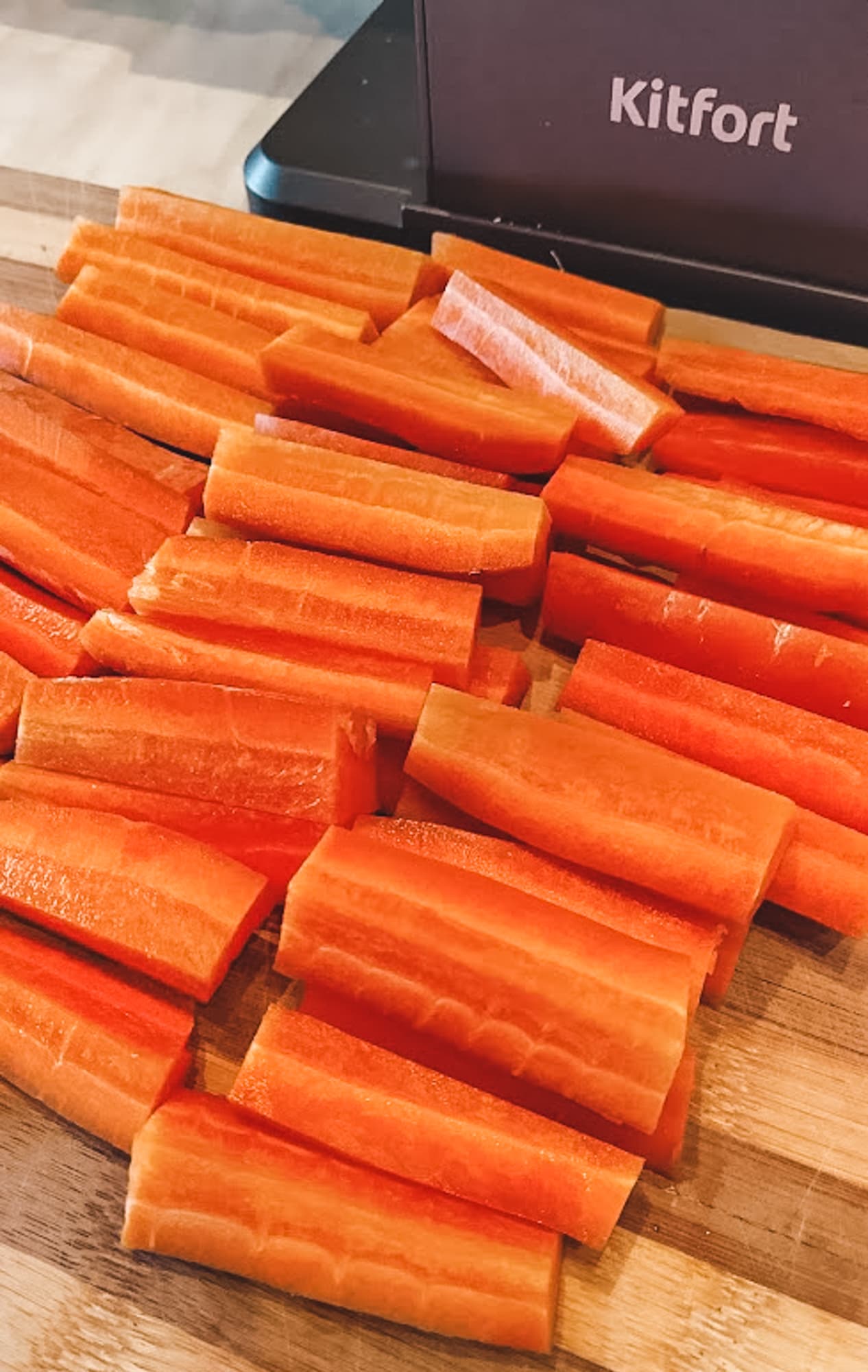 Килограмм моркови нарезали короткими дольками.