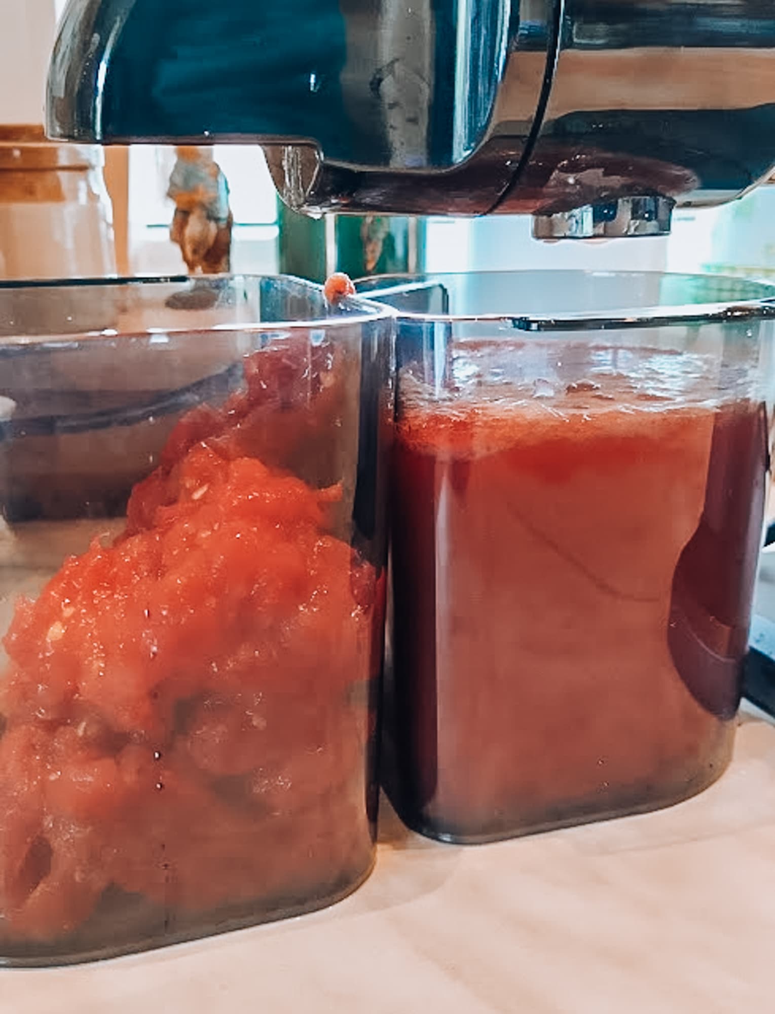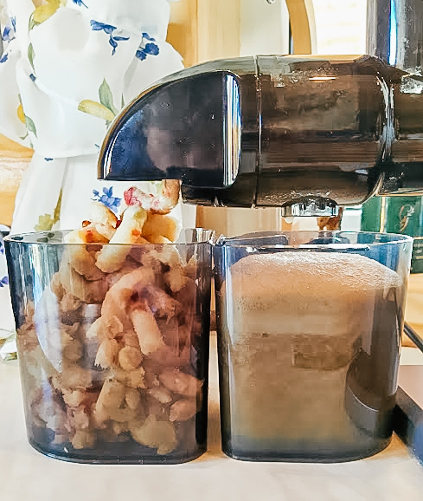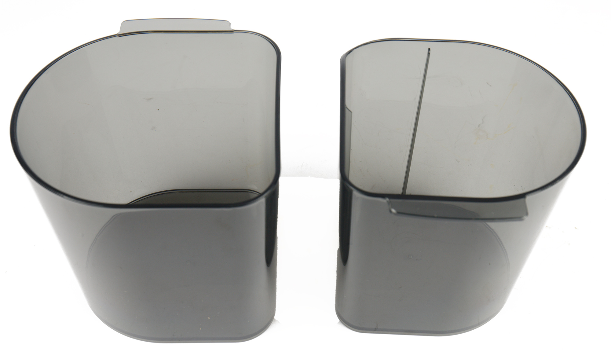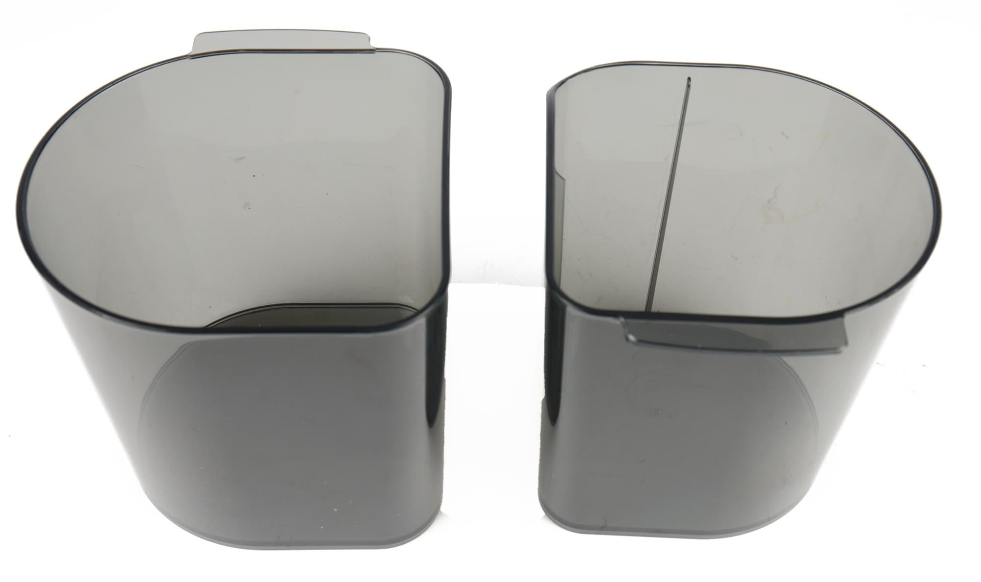 Пластиковые полупрозрачные контейнеры выглядят почти идентично, только емкость для жмыха чуть больше, а в емкости для сока есть отсек для декантера.