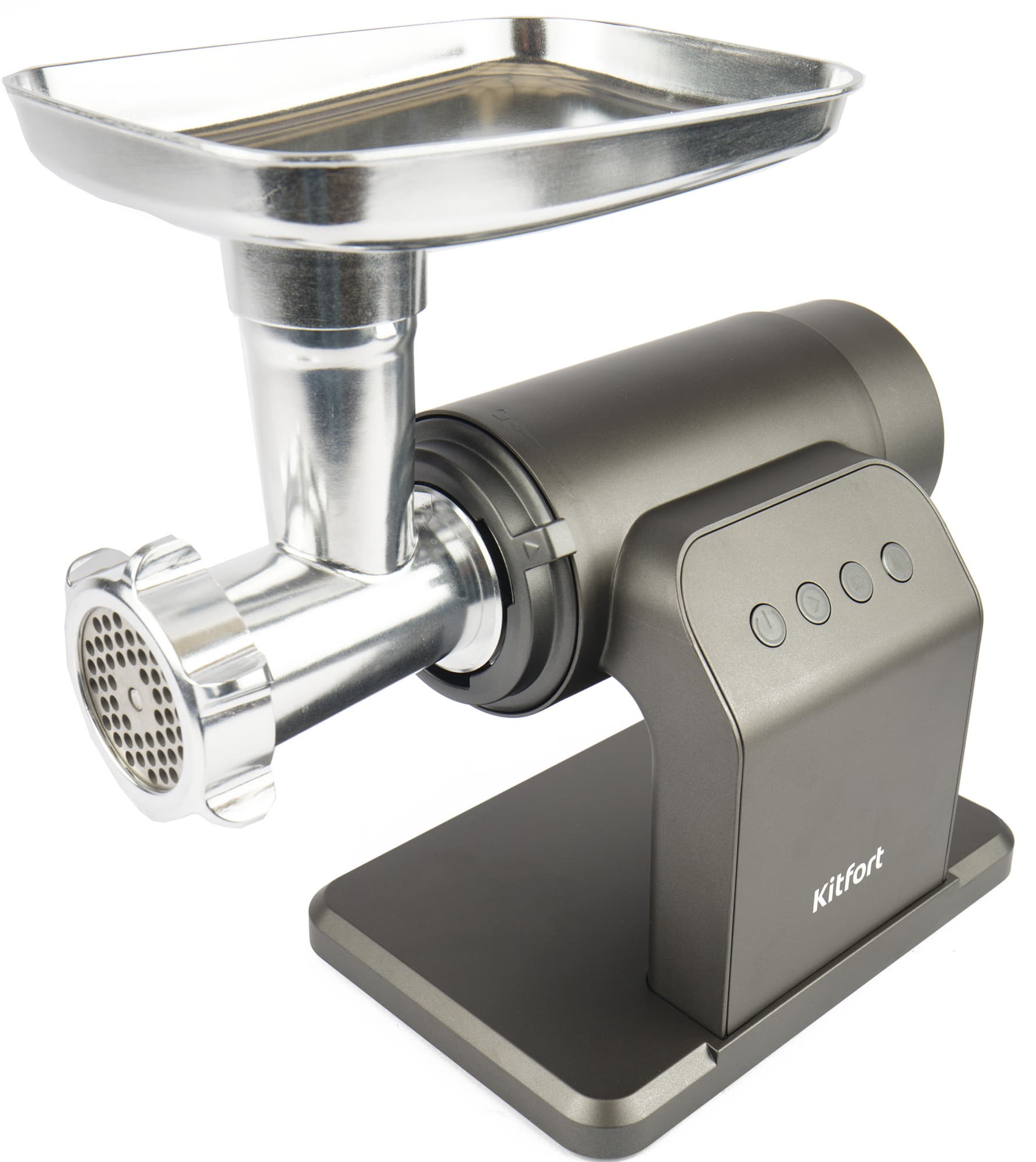 Якобы черный, но больше похожий на темно-серый корпус мясорубки Kitfort KT-2109 привлекает внимание своей необычной формой. Из прямоугольного основания поднимается изогнутая «ножка», на ней расположена панель управления. К ножке прикреплен цилиндрический моторный блок. Корпус невелик, благодаря оригинальной конструкции для него легко найти место даже на небольшой кухне.