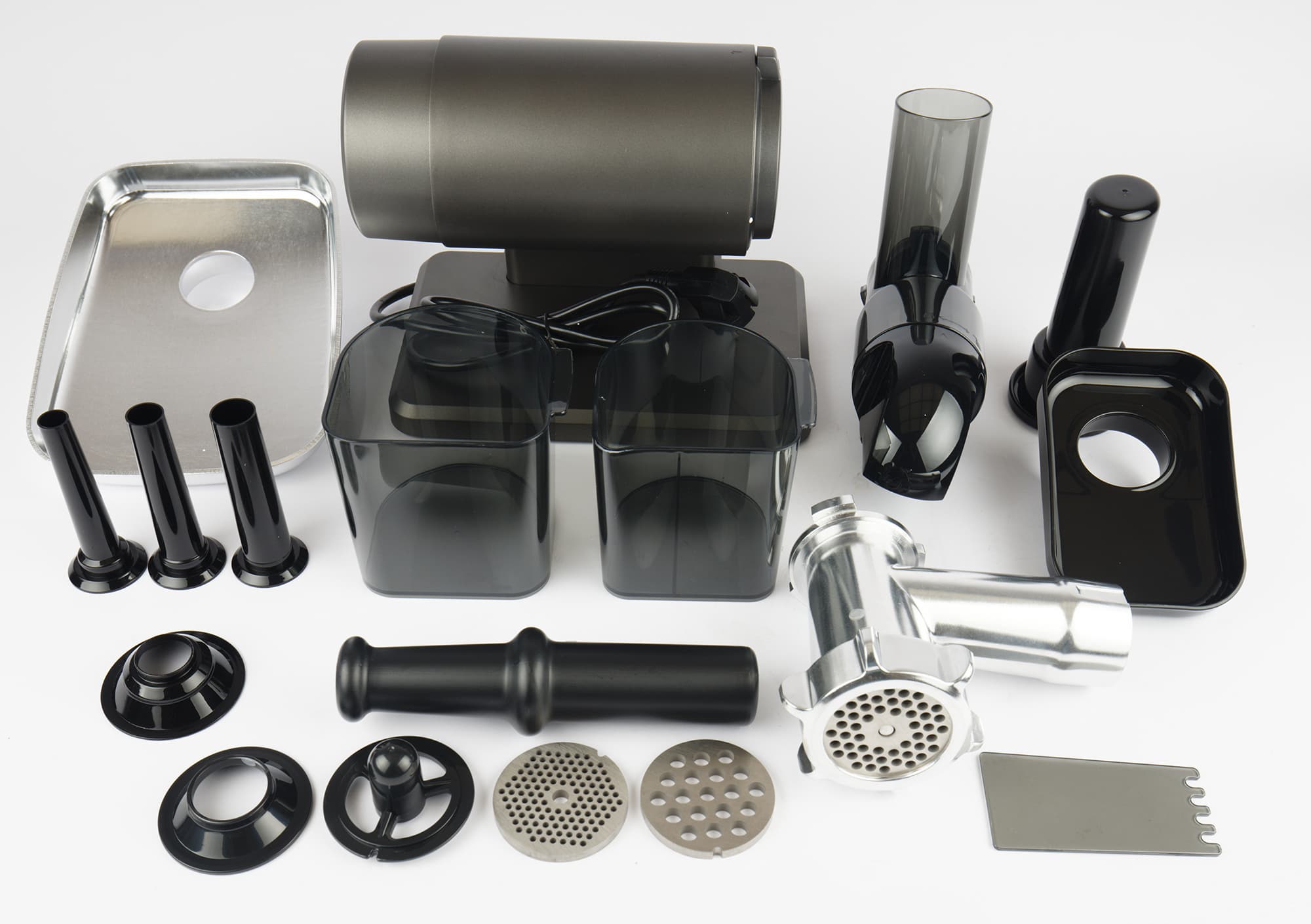 Все аксессуары выполнены из черного пластика. Помимо толкателя к мясорубке прилагаются три насадки для приготовления колбасок разной толщины и две насадки для кеббе. На фото также затесался декантер — он относится к соковыжималке.