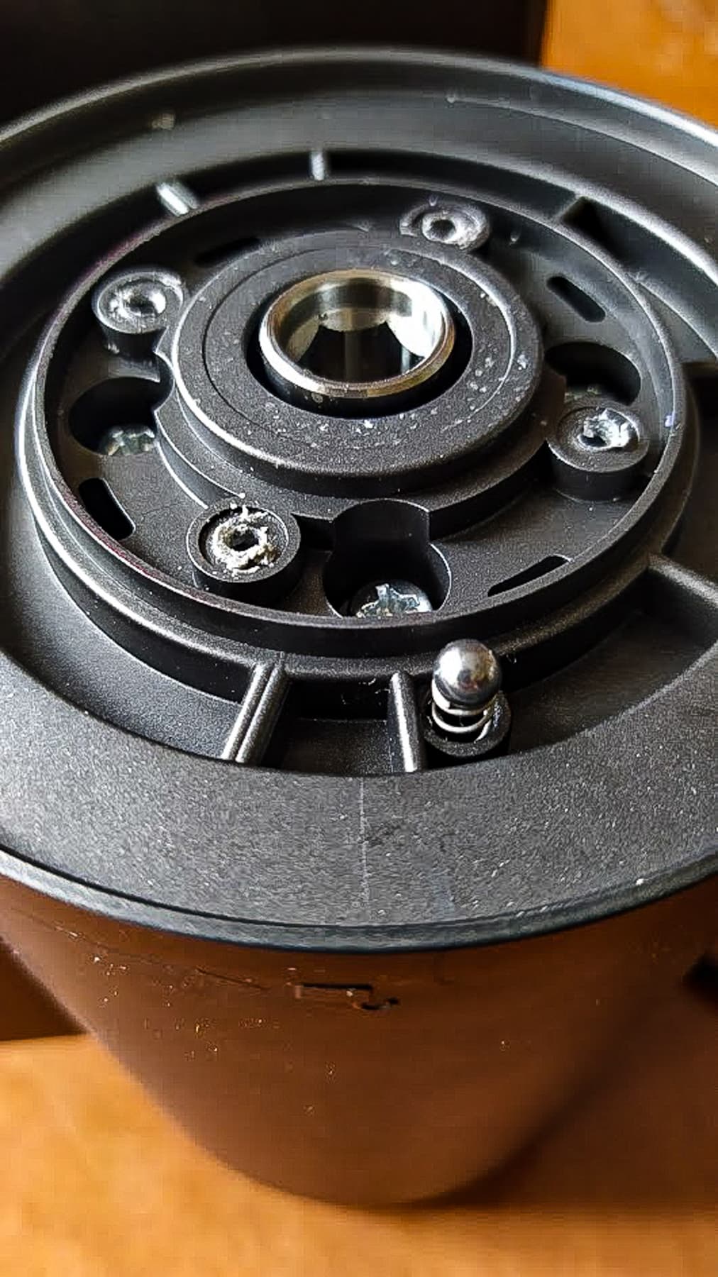 Чтобы подобраться к внутренностям Kitfort KT-2109, нам пришлось преодолеть несколько рядов саморезов и болтов, но обошлись мы одной крестовой отверткой. Первые 4 шурупа оказались вкручены в пластик, и процесс их извлечения явно материалу не понравился — края отверстий раскрошились.