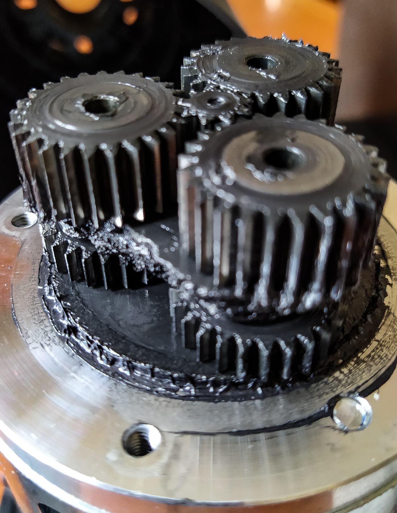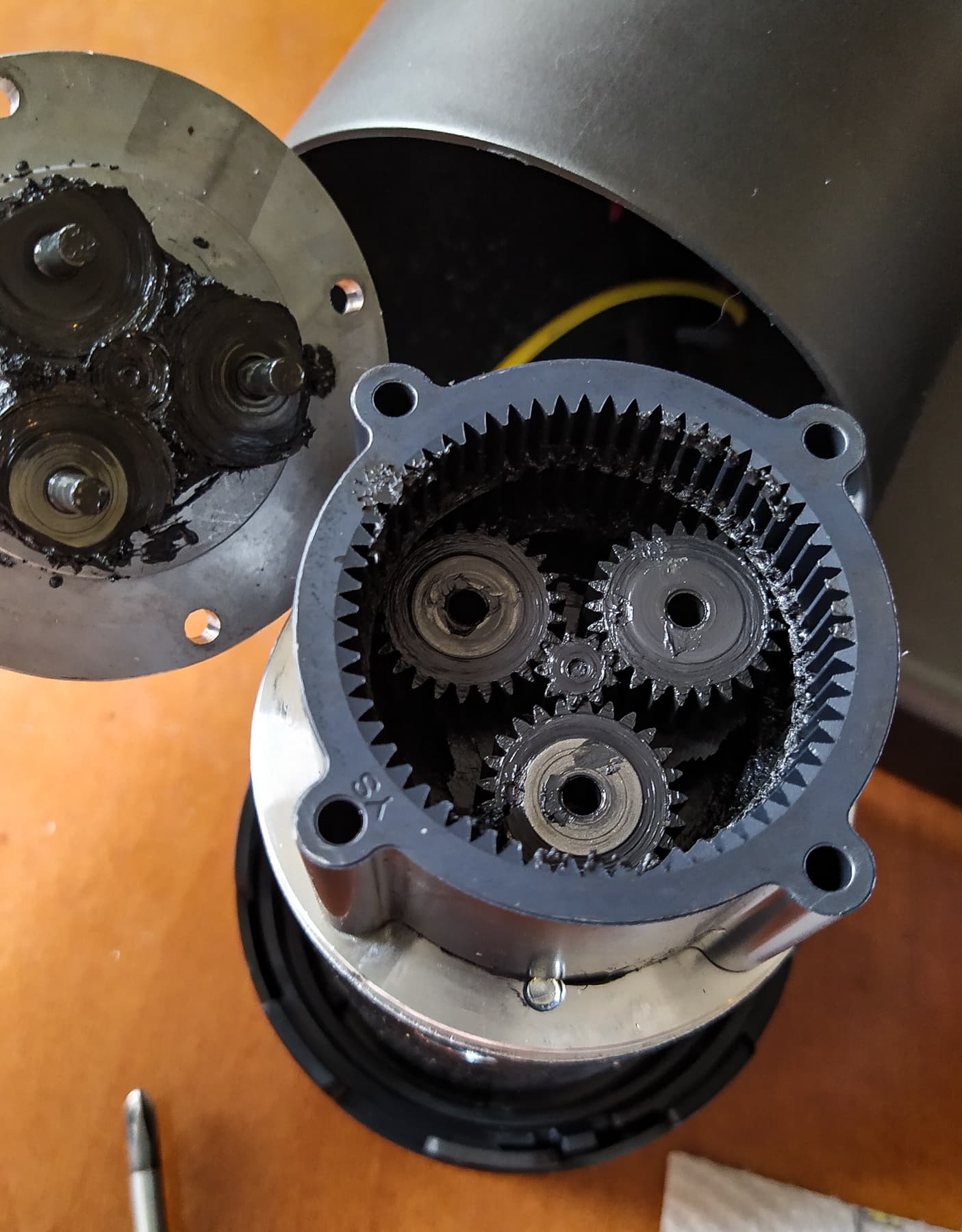 Еще четыре болта — и перед нами щедро смазанный планетарный редуктор, состоящий из двух рядов металлических шестеренок, коих мы насчитали восемь.