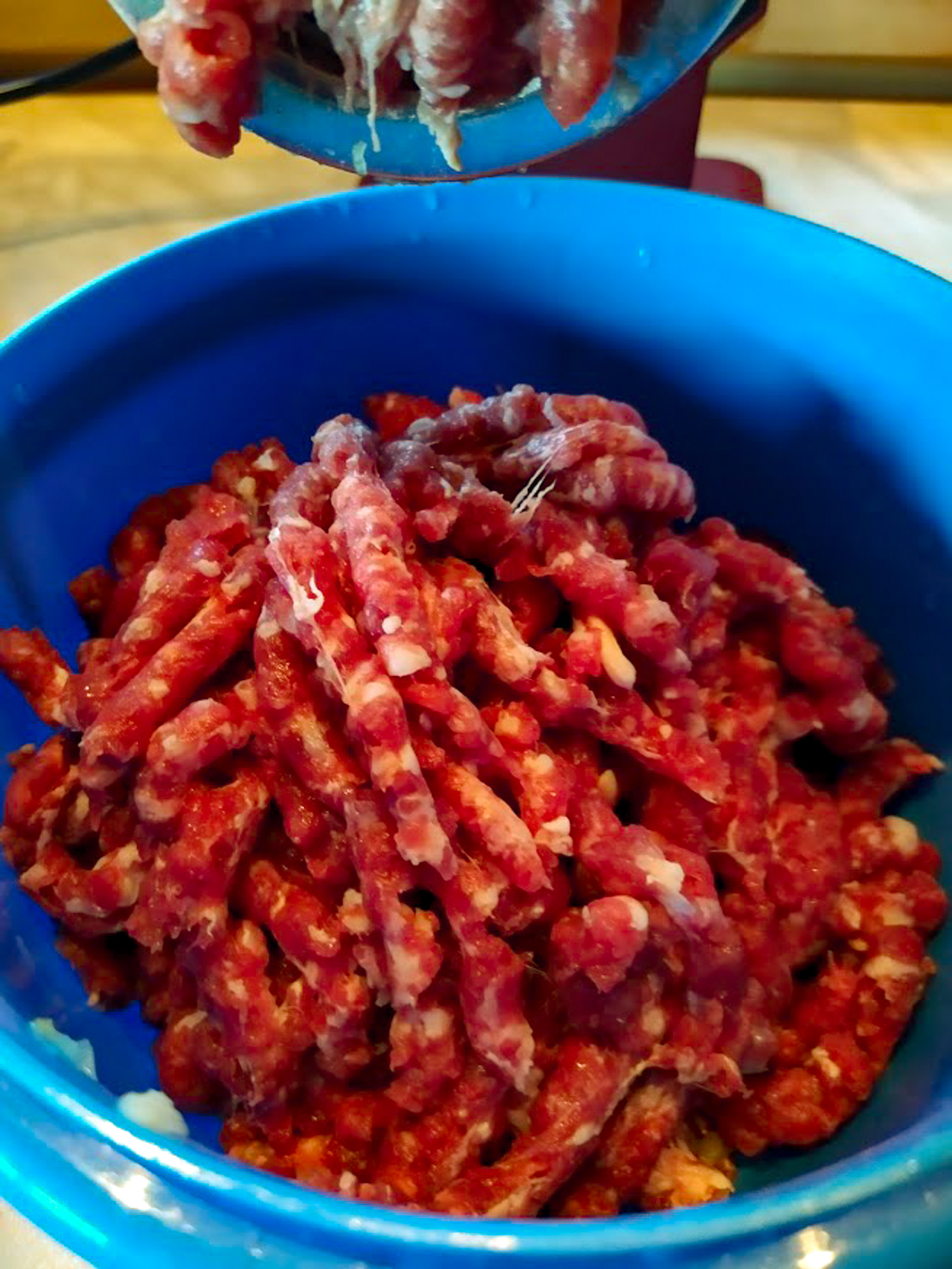 1200 граммов филе грудки индейки и 300 граммов свиного жира проскочили через мясорубку за полторы минуты.