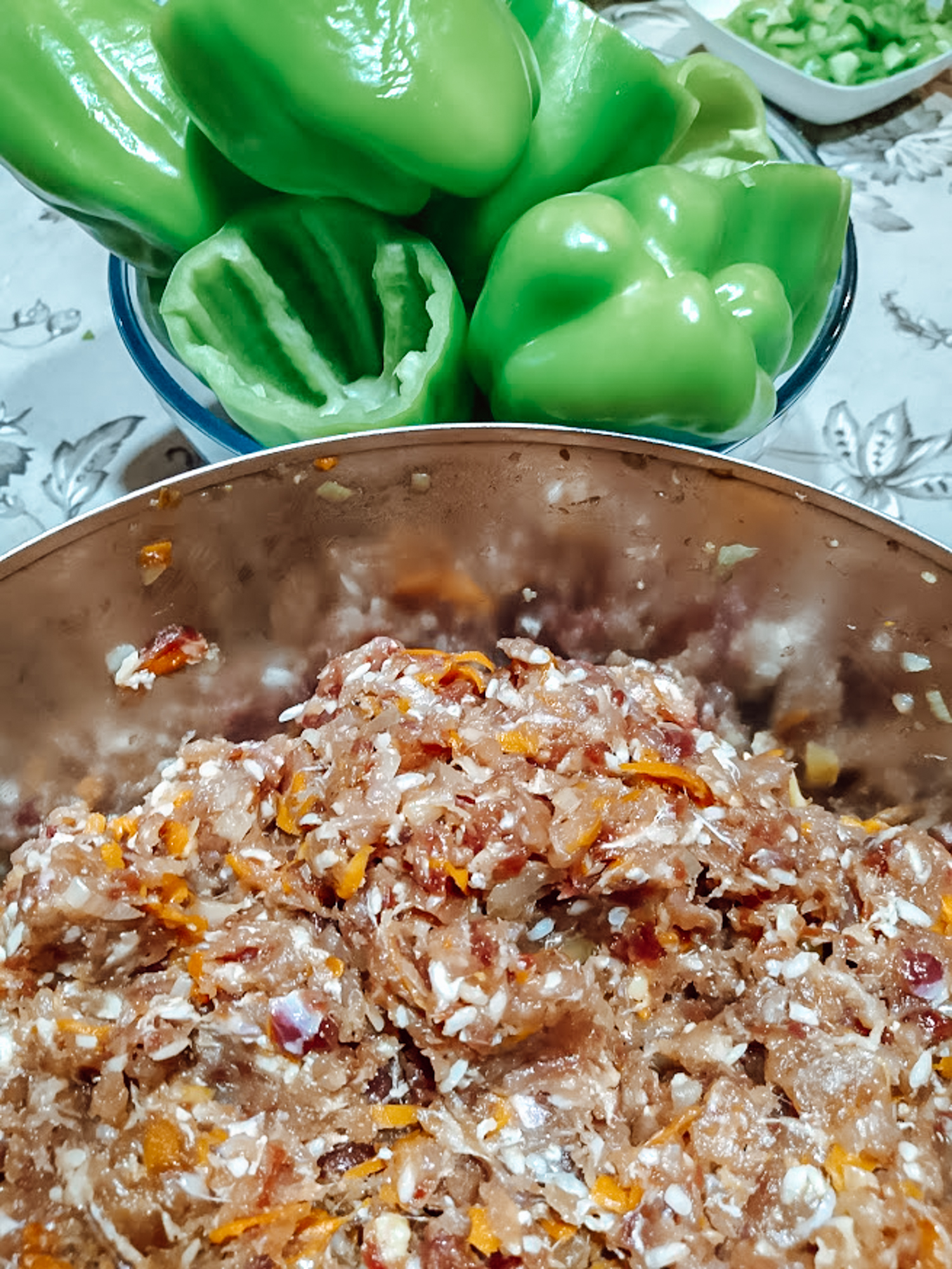Полученный в ходе двух первых тестов фарш мы перемешали, добавили лука, моркови, риса и приготовили тефтели и фаршированный перец.