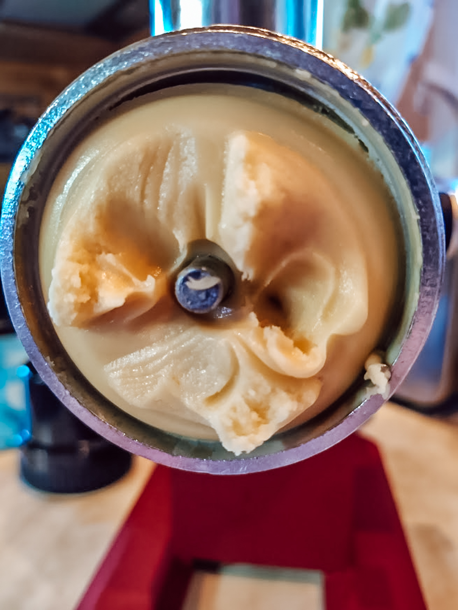Отдохнувшее тесто отправляли в горловину и принимали на выходе, отрезая кусочки от вылезающей из насадки колбаски. Работали на первой скорости, так как на второй тесто вылетало уж как-то совсем лихо. Признаться, процесс нас не впечатлил, как-то это все бестолково: песочное тесто требует холода и сноровки, а тут с ним проводится множество манипуляций, оно начинает таять, да и красотой получающиеся заготовки не отличаются.