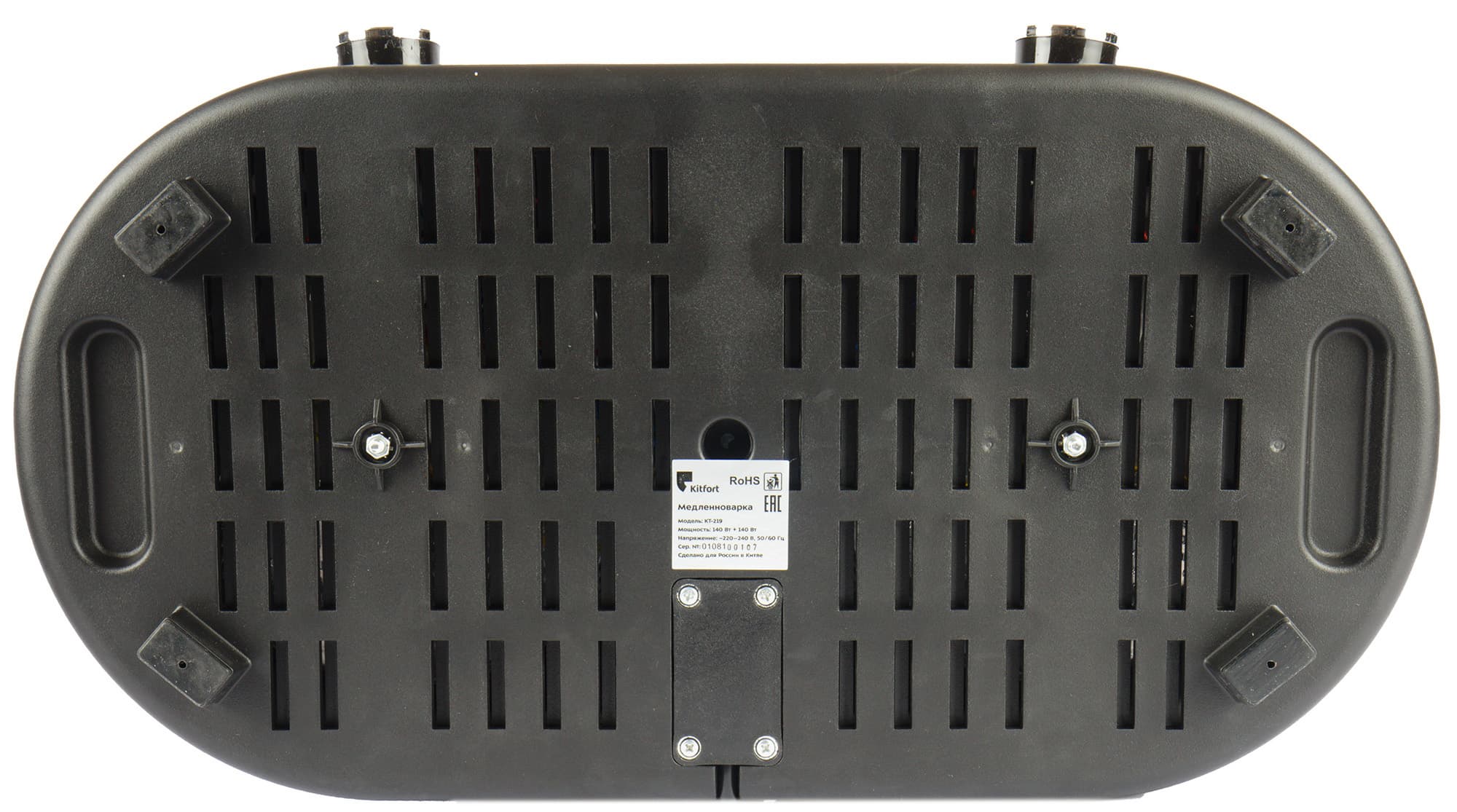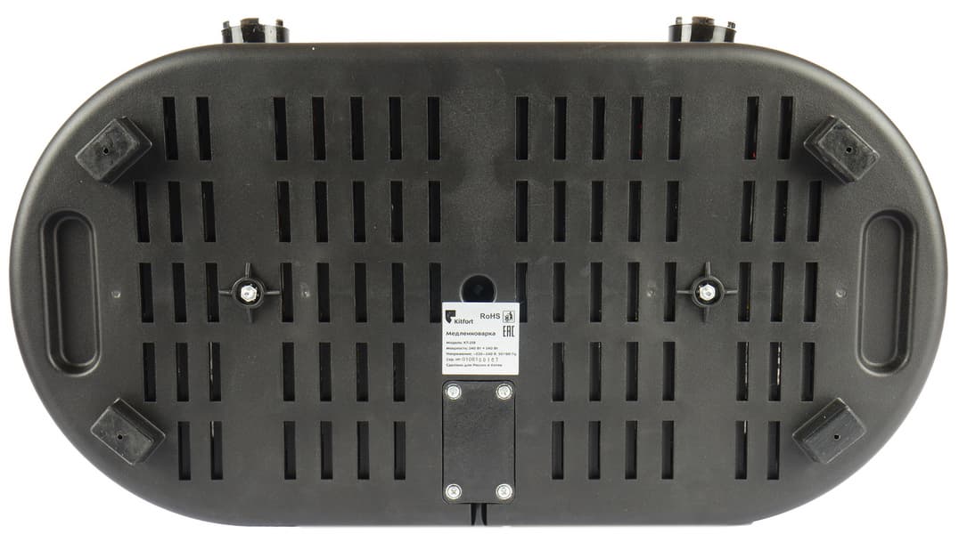 На дне медленноварки мы видим большое количество мелких технических и вентиляционных отверстий, 4 пластиковые ножки и шильдик с краткой технической информацией в центре, а из задней части прибора выходит неотделяемый шнур электропитания.