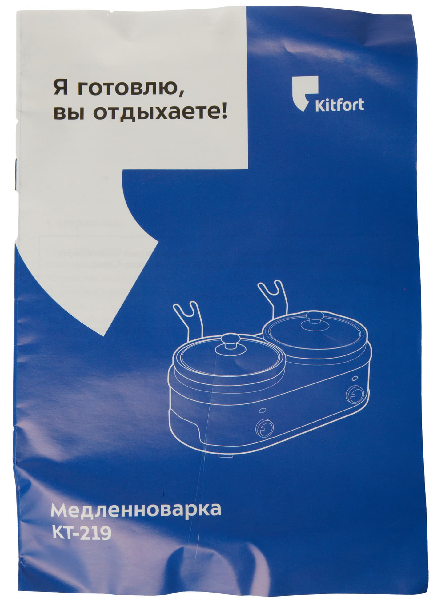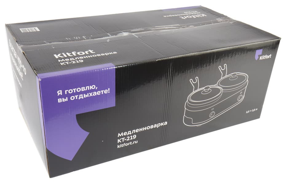 Прибор приехал к нам в крупной брендированной прямоугольной коробке Kitfort черного, белого и фиолетового цветов. На лицевой стороне помимо схематического изображения медленноварки мы видим наименование бренда и данной модели, а также ее лозунг — «Я готовлю, вы отдыхаете!»