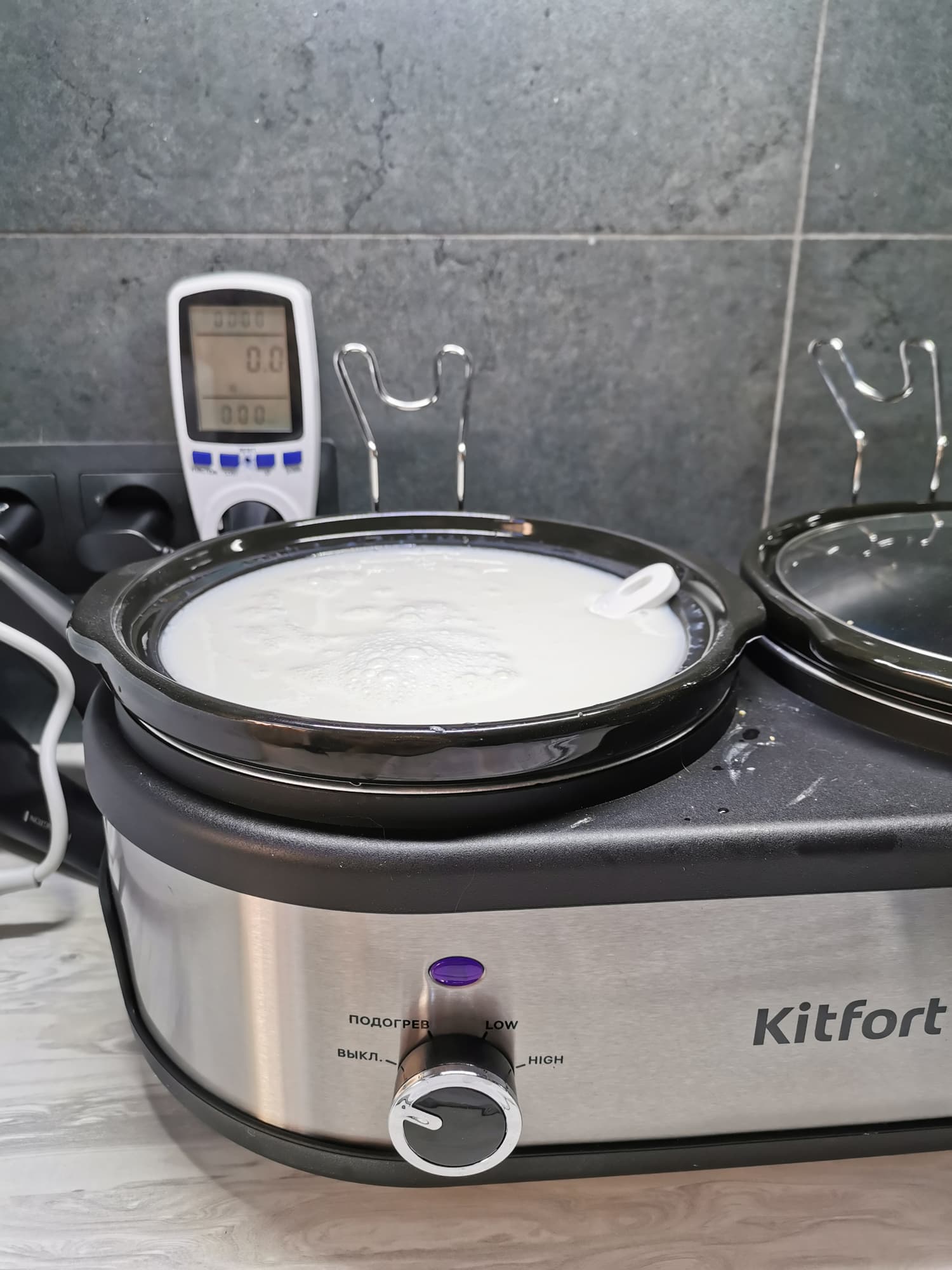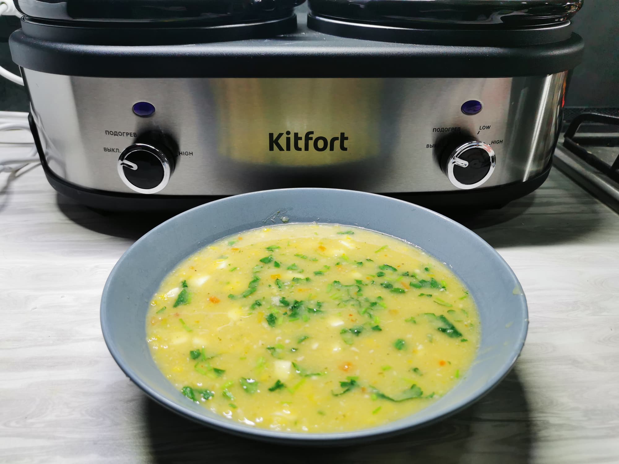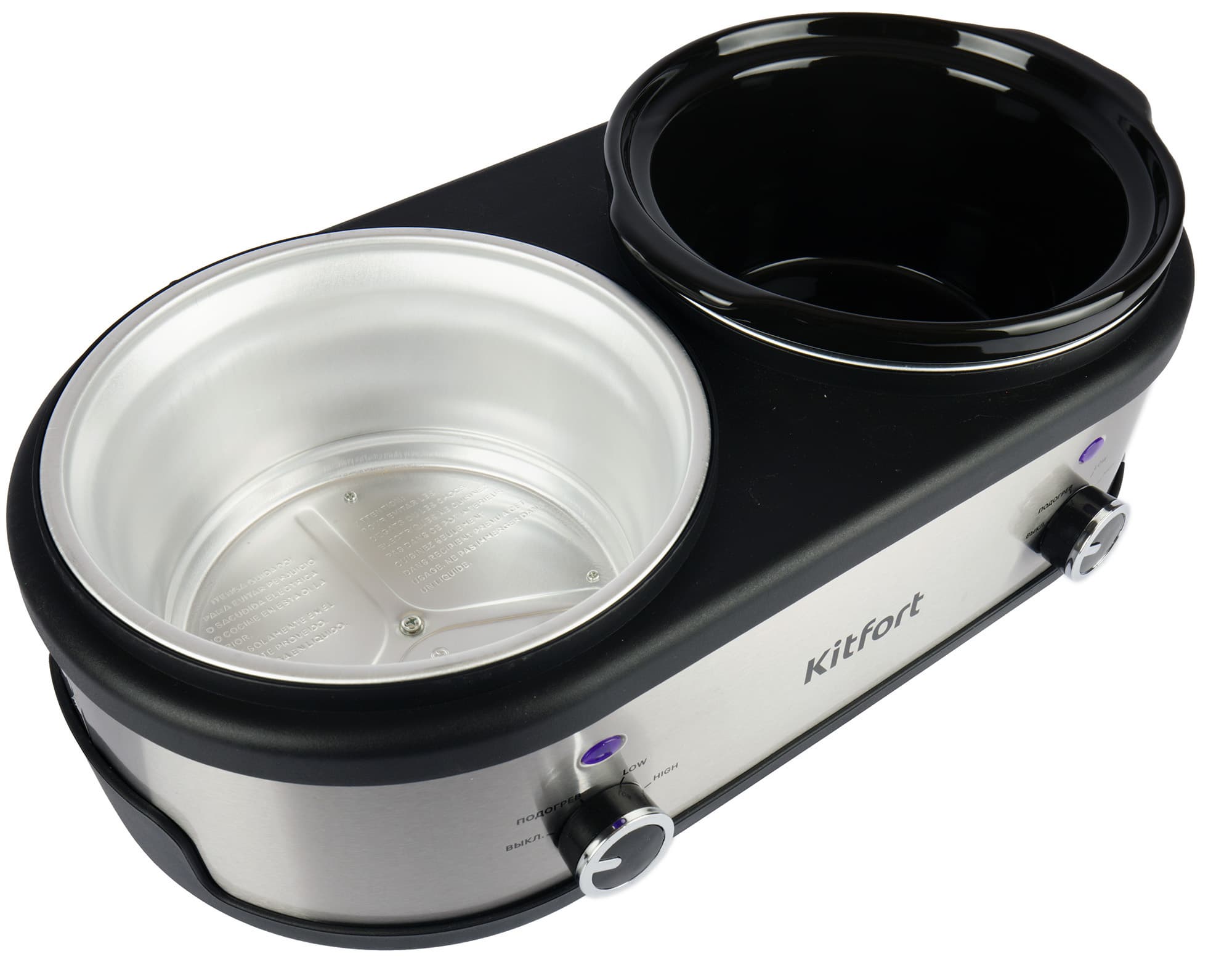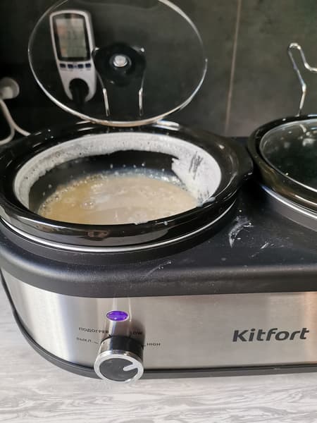 Сегодня мы протестируем медленноварку Kitfort КТ-219 с двумя кастрюлями. Данный агрегат готовит блюда особым способом — томлением. Производитель сообщает, что температура приготовления находится в диапазоне 60—120 °C. Благодаря керамической кастрюле пища равномерно нагревается со всех сторон. Нагреватель расположен по периметру в нижней части емкости для хорошего распределения тепла.