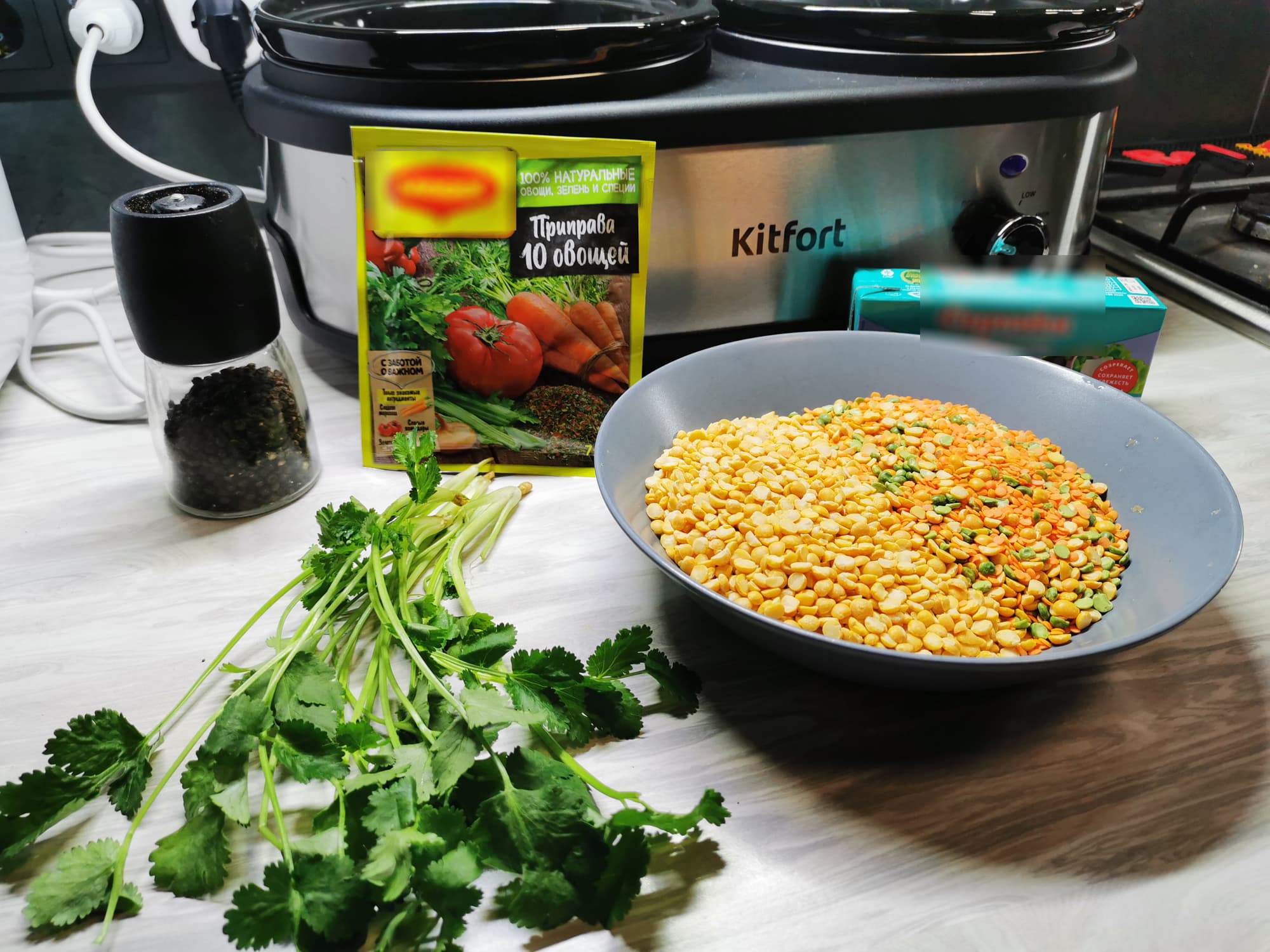 Для него нам понадобились такие ингредиенты: 1 стакан колотого желтого гороха, 0,5 стакана смеси красной чечевицы и зеленого колотого гороха, 4 стакана воды, 1 горсть сушеных овощей, упаковка брынзы, пучок свежей кинзы, соль и черный молотый перец.