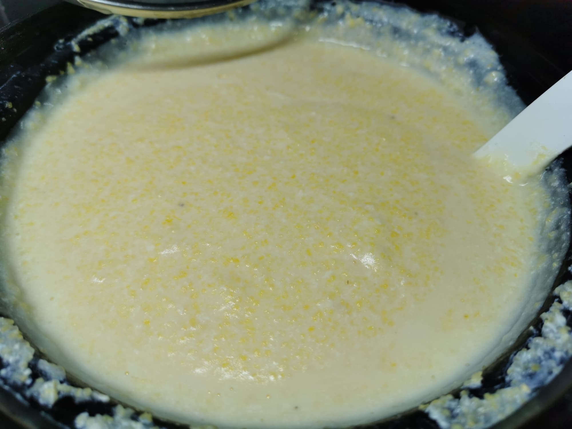 Поэтому засыпали в кастрюлю кукурузную крупу, залили ее водой и молоком, добавили сахар и соль и перемешали все ингредиенты до растворения сахара.