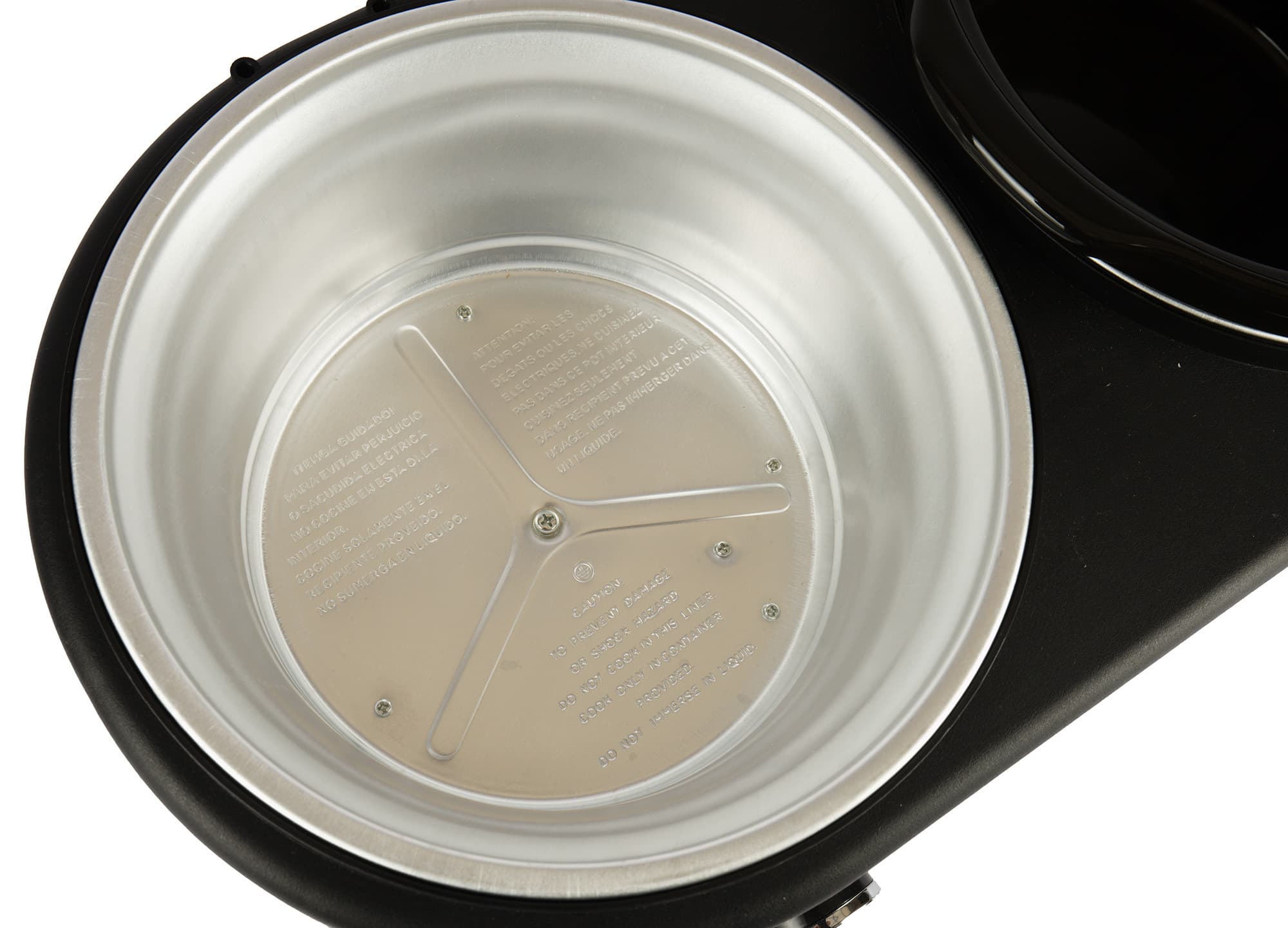 По периметру нижней части емкости для нагрева расположен нагреватель. Нагрев каждой кастрюли регулируется отдельно. На алюминиевом днище указана предупреждающая информация на трех языках о том, что во избежание порчи прибора или получения удара током, запрещается допускать появления продуктов или жидкостей внутри данной емкости и для приготовления пищи необходимо использовать идущие в комплекте чаши.
