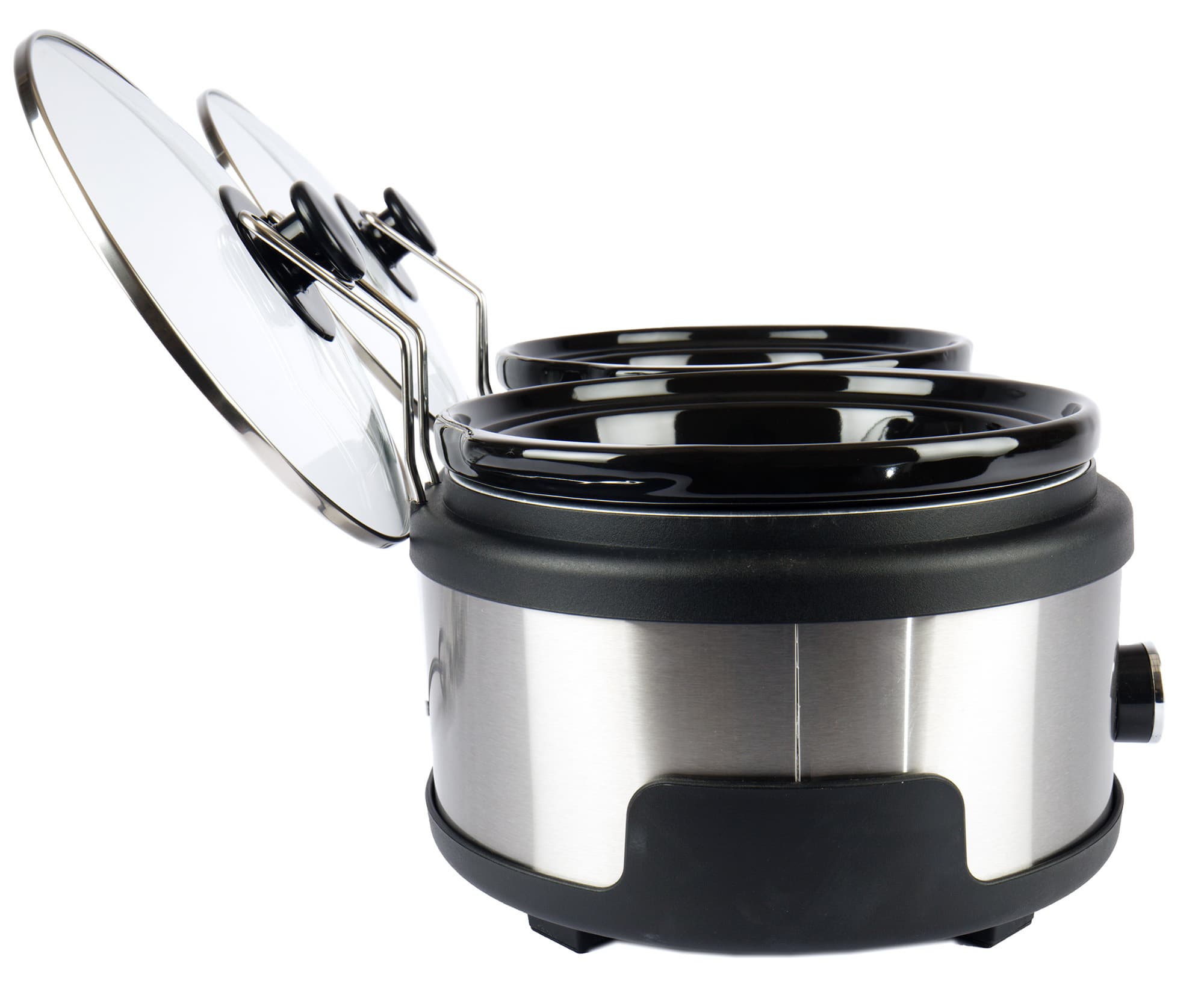Металлический корпус с черными пластиковыми вставками, простой и лаконичный дизайн, металлические подставки под крышки, надежно крепящиеся в основании, сами стеклянные крышки с металлическим ободком и гладкие блестящие керамические чаши делают медленноварку весьма привлекательной в глазах изучающего. Первое впечатление от прибора — что он качественный, аккуратный и, должно быть, легок в эксплуатации.