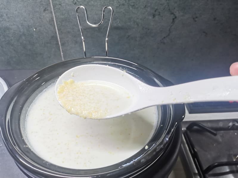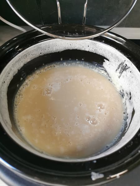 Мы вылили прохладное молоко в кастрюльку, добавили в нее сахар и в течение нескольких минут после включения медленноварки помешивали содержимое, чтобы сахар растворился, а не прилип ко дну и не слипся в комочки.