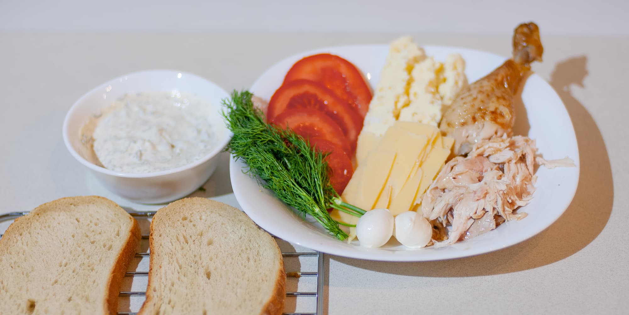 Мы взяли мясо холодной куры-гриль, российский сыр, козий сыр (для остроты), моцареллу, помидоры, чеснок, булку и зелень. Для соуса смешали сметану, сливки, майонез, черный перец, укроп и соль в блендере.