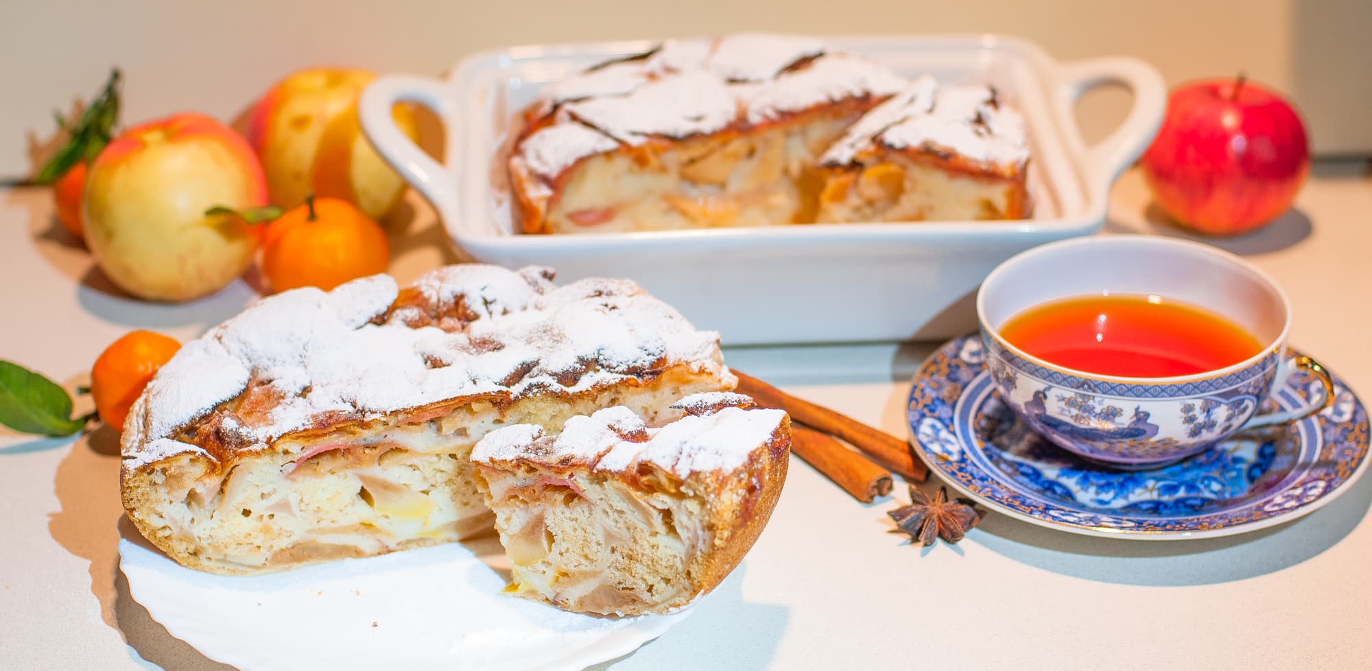 Для шарлотки мы использовали 3 яйца, стакан муки, стакан сахара, соду, соль и четыре крупных яблока. Пекли в антипригарных формах. Один пирог мы поставили на режим «выпечка», но так как вес получился около килограмма, мы добавили время до 45 минут.