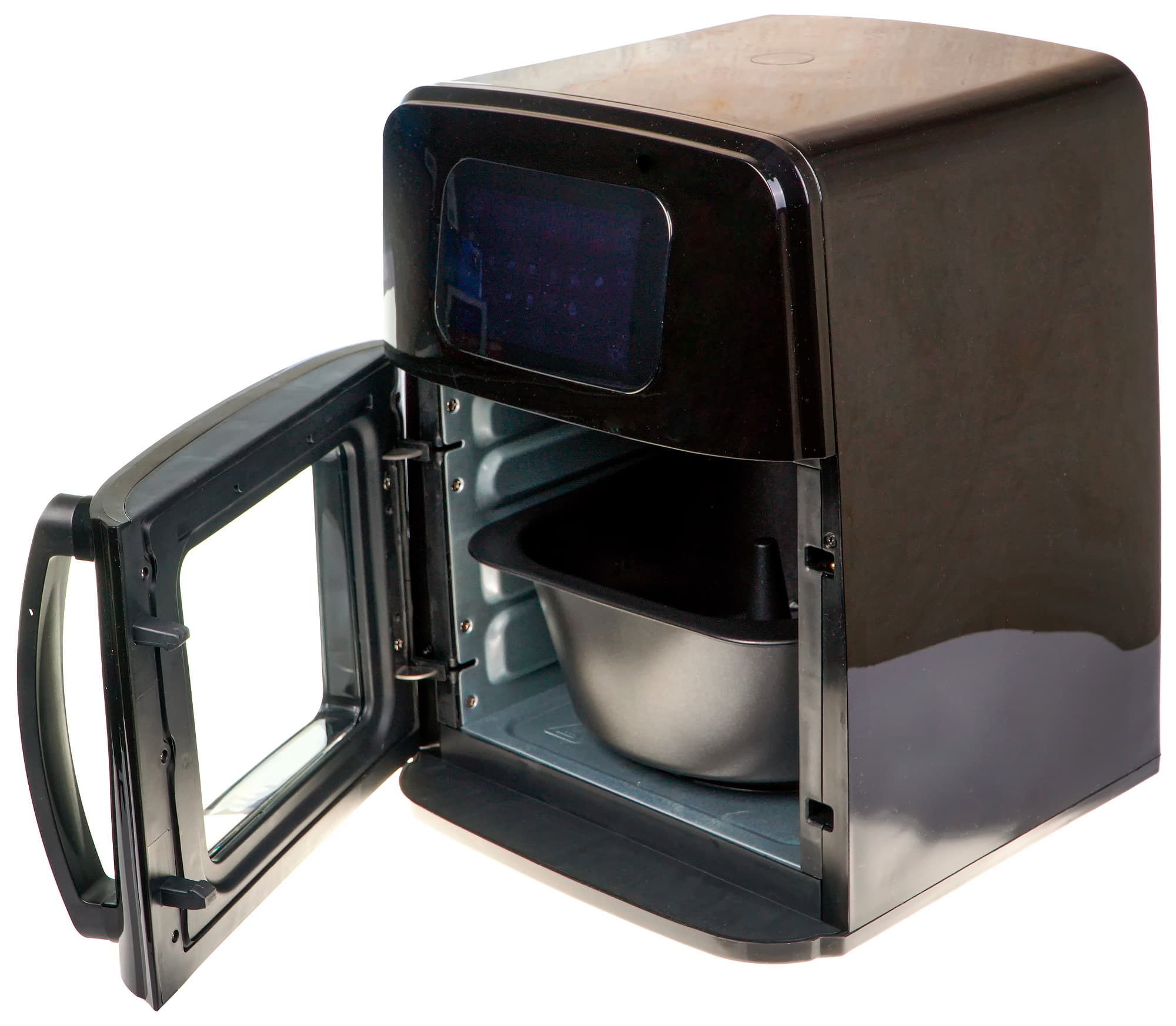 Аэрогриль КТ-2212 уже совсем не напоминает гибрид кастрюли с вентилятором, как классические модели этих устройств. По своему внешнему виду это скорее небольшая конвекционная печь или микроволновка — прямоугольный корпус, стеклянная дверца на петлях, расположенное сверху электронное табло управления.