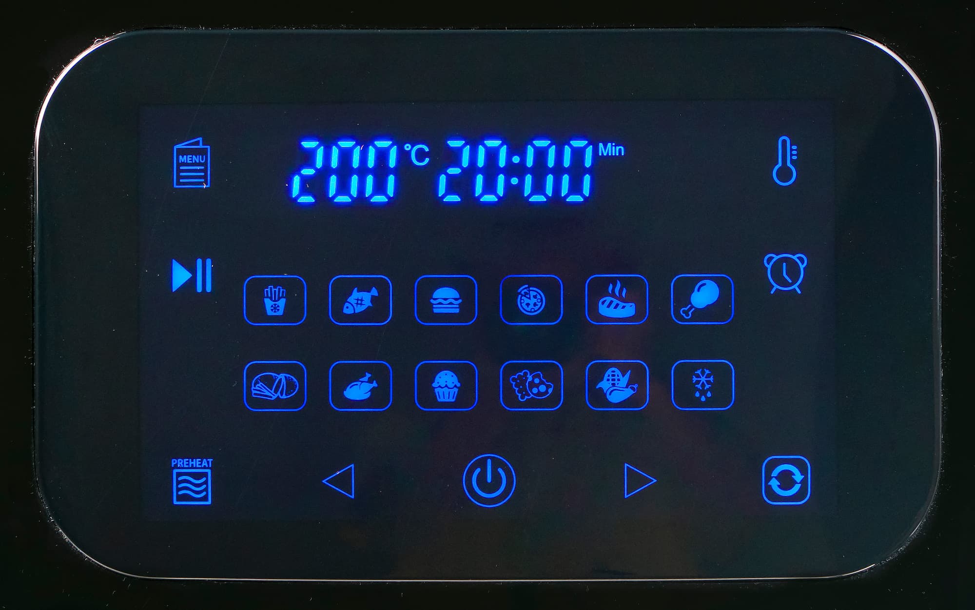 На дисплее отображаются 12 программ приготовления, температура, время и индикация статуса работы, а также служебные значки, служащие для выбора программ или самостоятельного программирования работы устройства.
