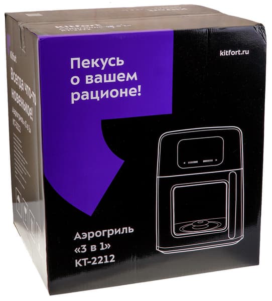 Аэрогриль прибыл на тесты в большой коробке из технического картона, внутри которой обнаружилась еще одна, уже цветная коробка, оформленная в обновленном стиле Kitfort. На черно-фиолетовом фоне мы видим кита, рекламные слоганы, название модели и ее возможности, а также технические характеристики. Ручками для переноски коробка не оборудована.