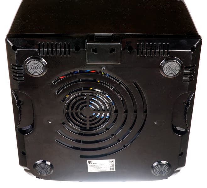 Внутри аэрогриль имеет два нагревательных элемента. Сверху карбоновый инфракрасный, защищенный металлической сеткой, а снизу классический тэн. Вентилятор находится сверху.