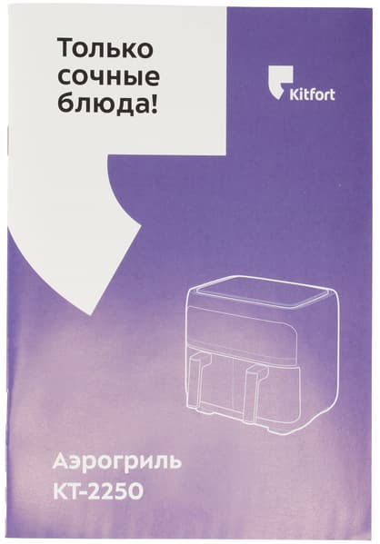 Инструкция к аэрогрилю Kitfort КТ-2250 напечатана на 18 страницах книжечки формата А5. В ней подробно описывается сам прибор, даются подробные рекомендации по приготовлению в нем основных типов блюд, рассматривается устранение неполадок и проблем при готовке.