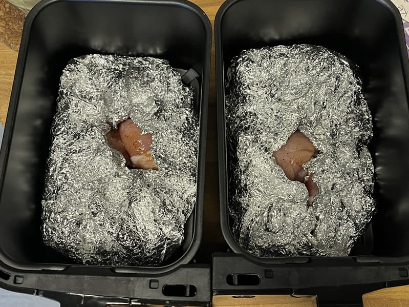 В лотки уложили фольгу, а сверху на нее курицу. После чего накрыли голени фольгой и сверху, оставив лишь по одному небольшому отверстию в каждой из чаш.