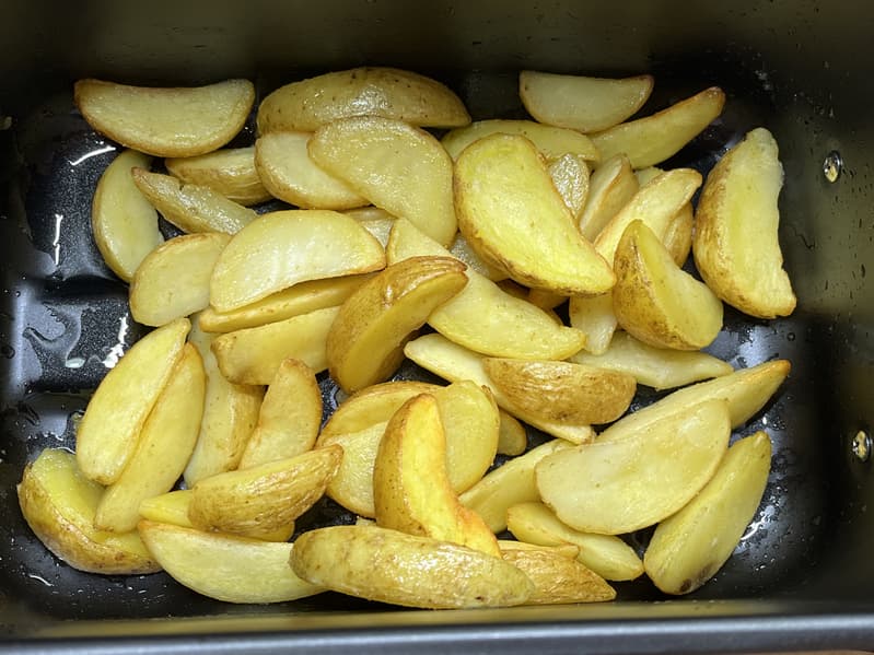 Картофель полностью приготовился за 15 минут при 200 градусах на режиме «Картошка-фри» и не разочаровал по равномерности обжарки.