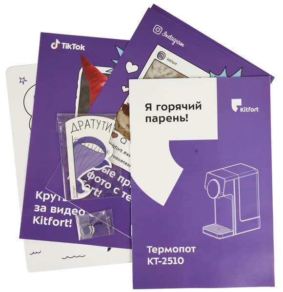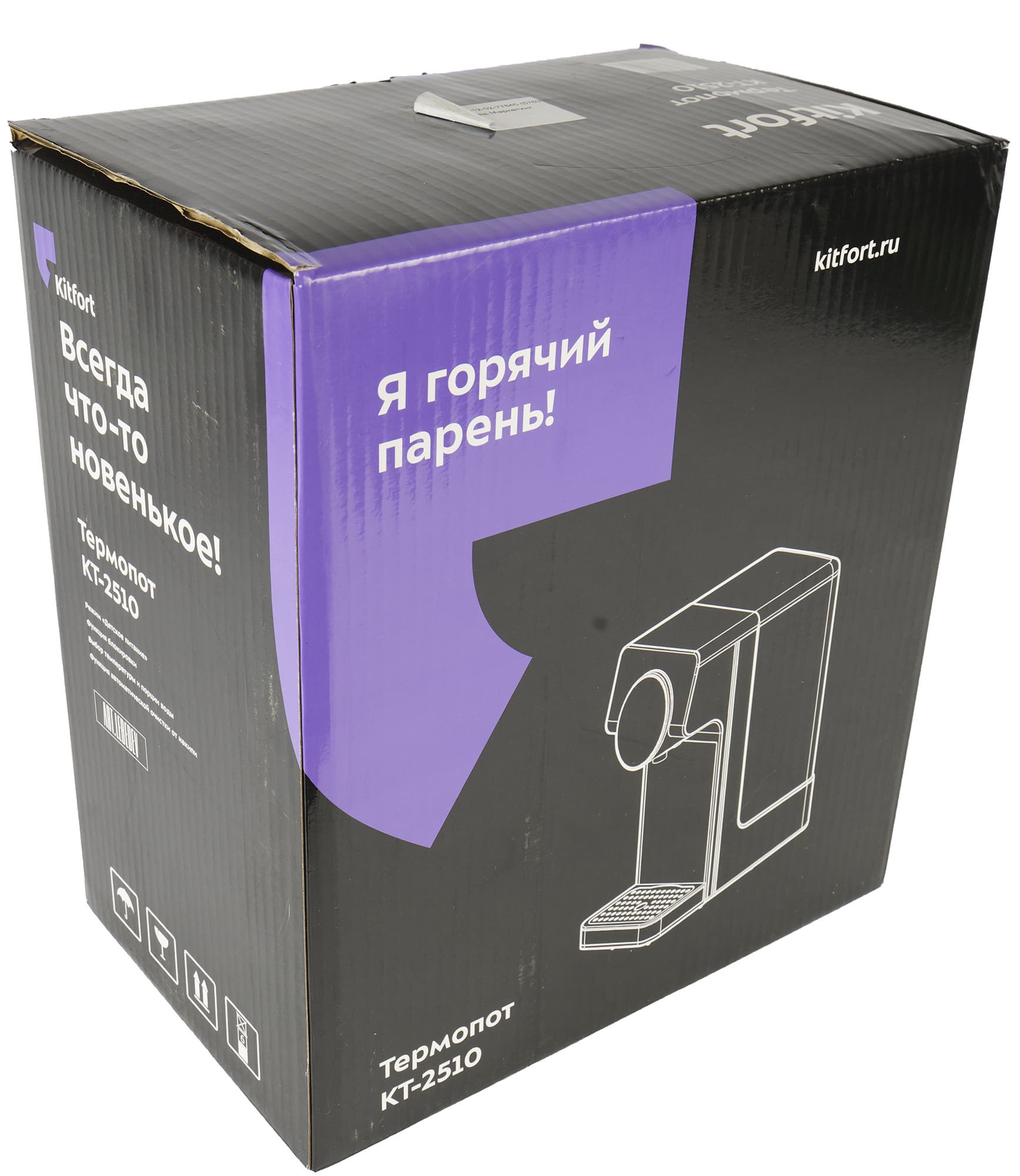 Прибор упакован в черно-фиолетовую коробку в фирменном дизайне Kitfort. Спереди у нее логотип производителя, схематическое изображение устройства, индекс модели и традиционный слоган, который маркетологи компании придумывают для каждого типа бытовой техники. В случае с нашим термопотом они сочли необходимым сообщить, что это горячий парень.