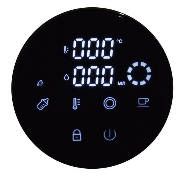 В верхней части на нем отображаются установленные пользователем объем и температура воды. Чуть ниже располагаются четыре сенсора, управляющие режимами работы и настройками.