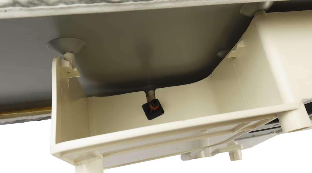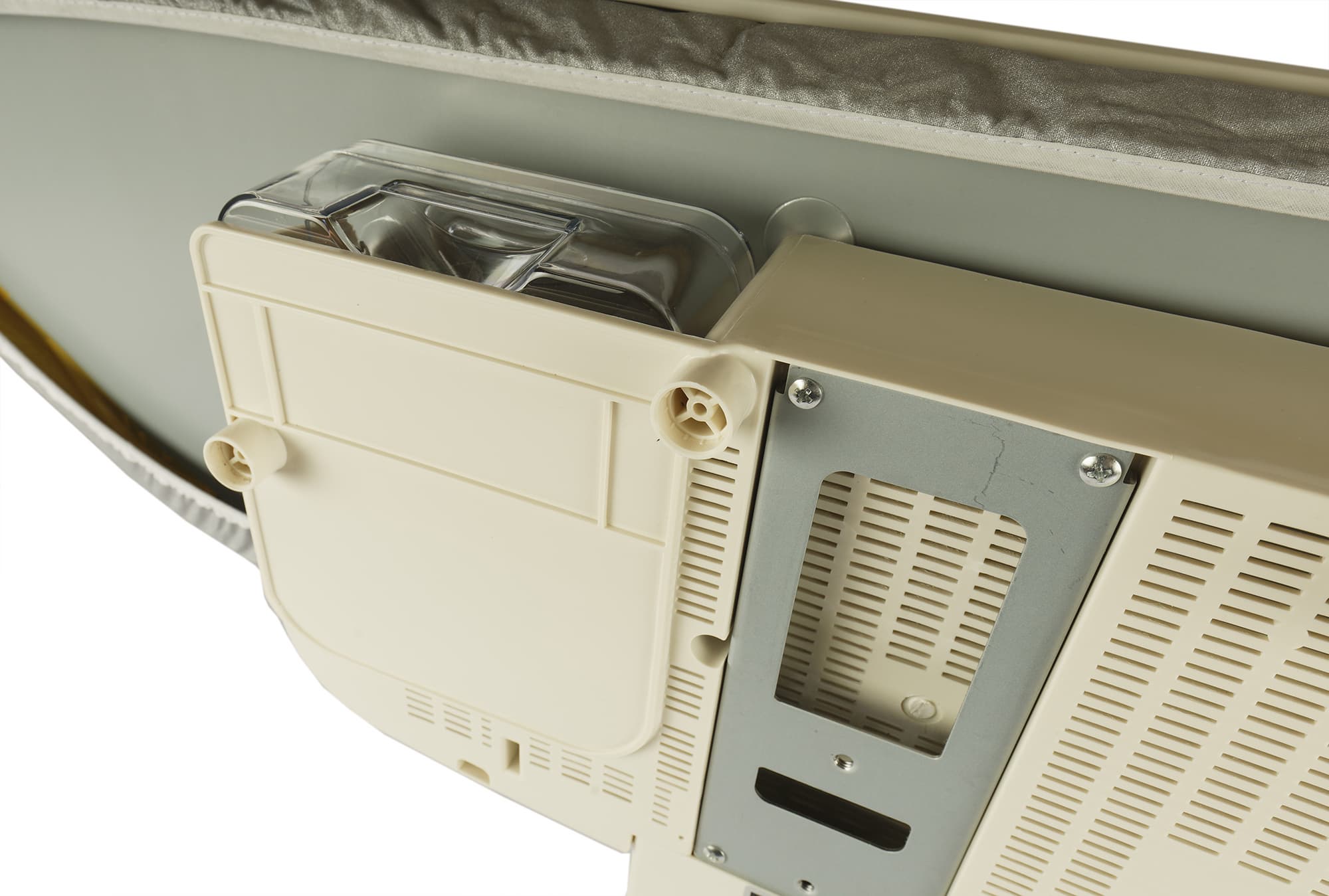 С фронтальной стороны слева под гладильной доской в корпусе есть углубление. В него вставляется емкость с водой.