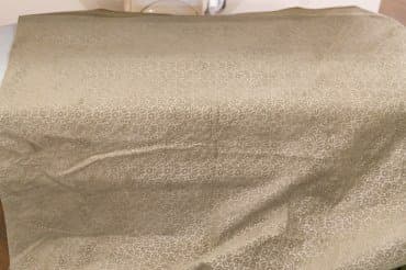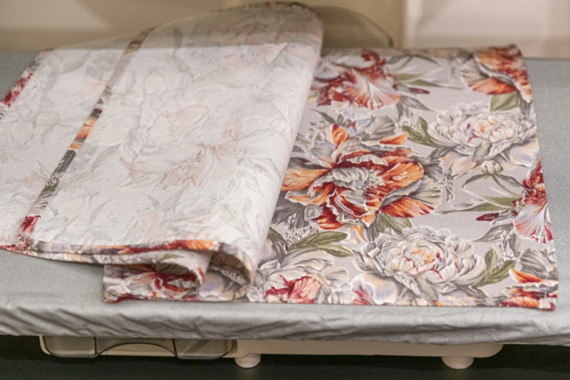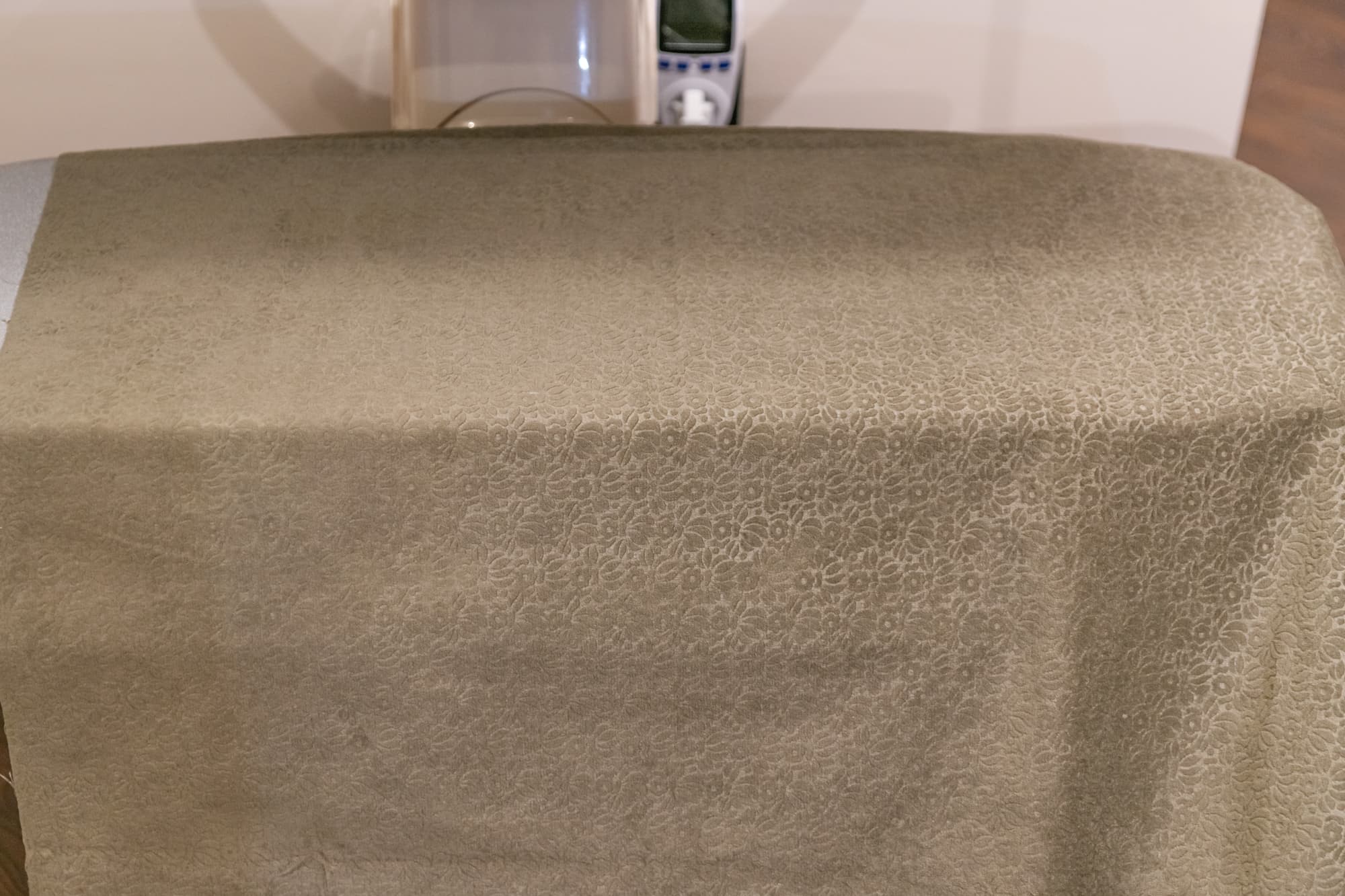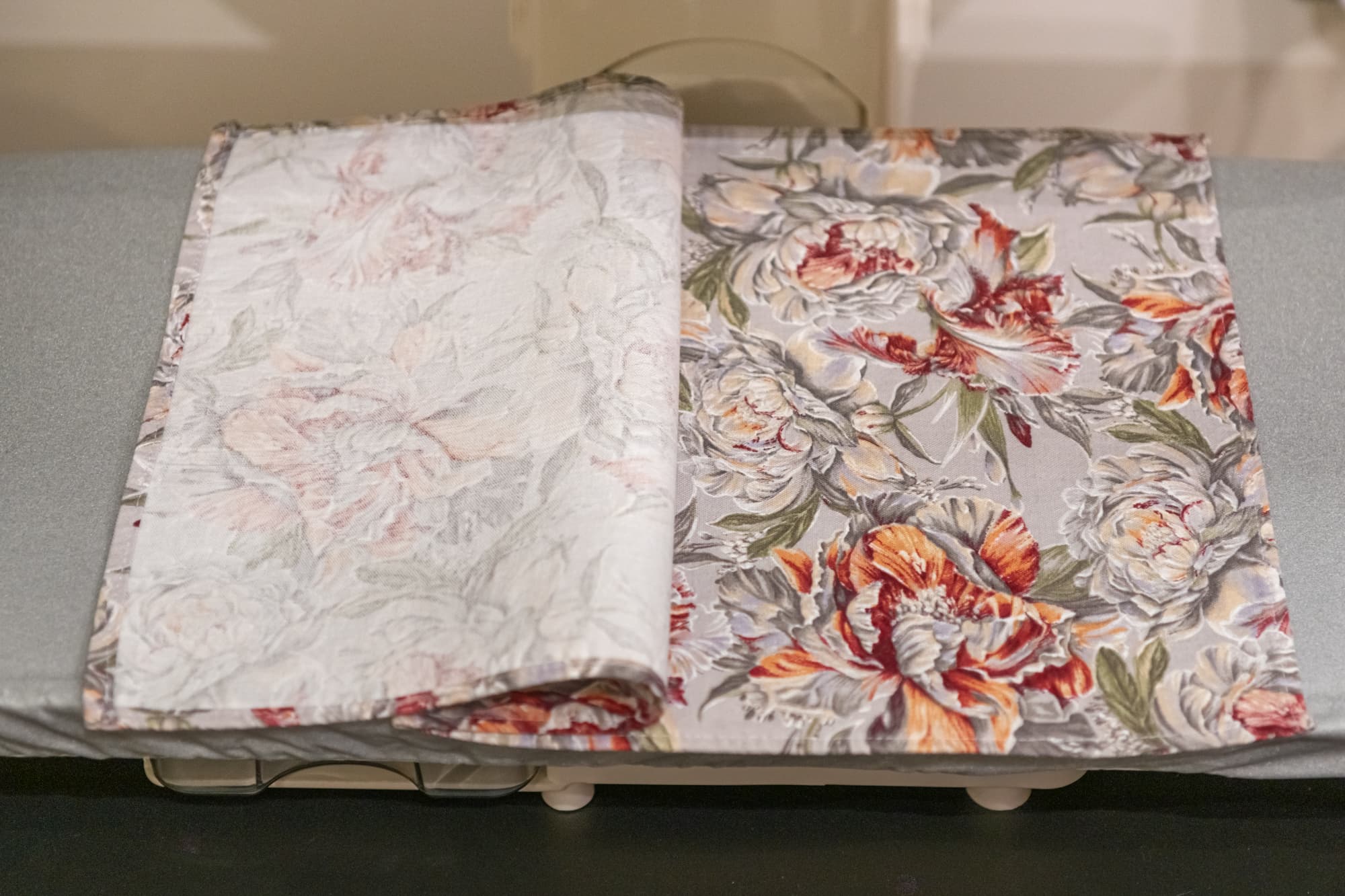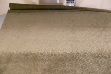 Плотная тяжелая портьерная ткань с тиснением давно лежала в сложенном виде и местами приобрела заломы. Обработку паром мы сочетали с придавливанием панелью, нагретой на максимальной температуре в режиме Linen. Пара движений прессом по одному и тому же месту позволили разгладить почти все серьезные замятия, оставив лишь небольшие складки.