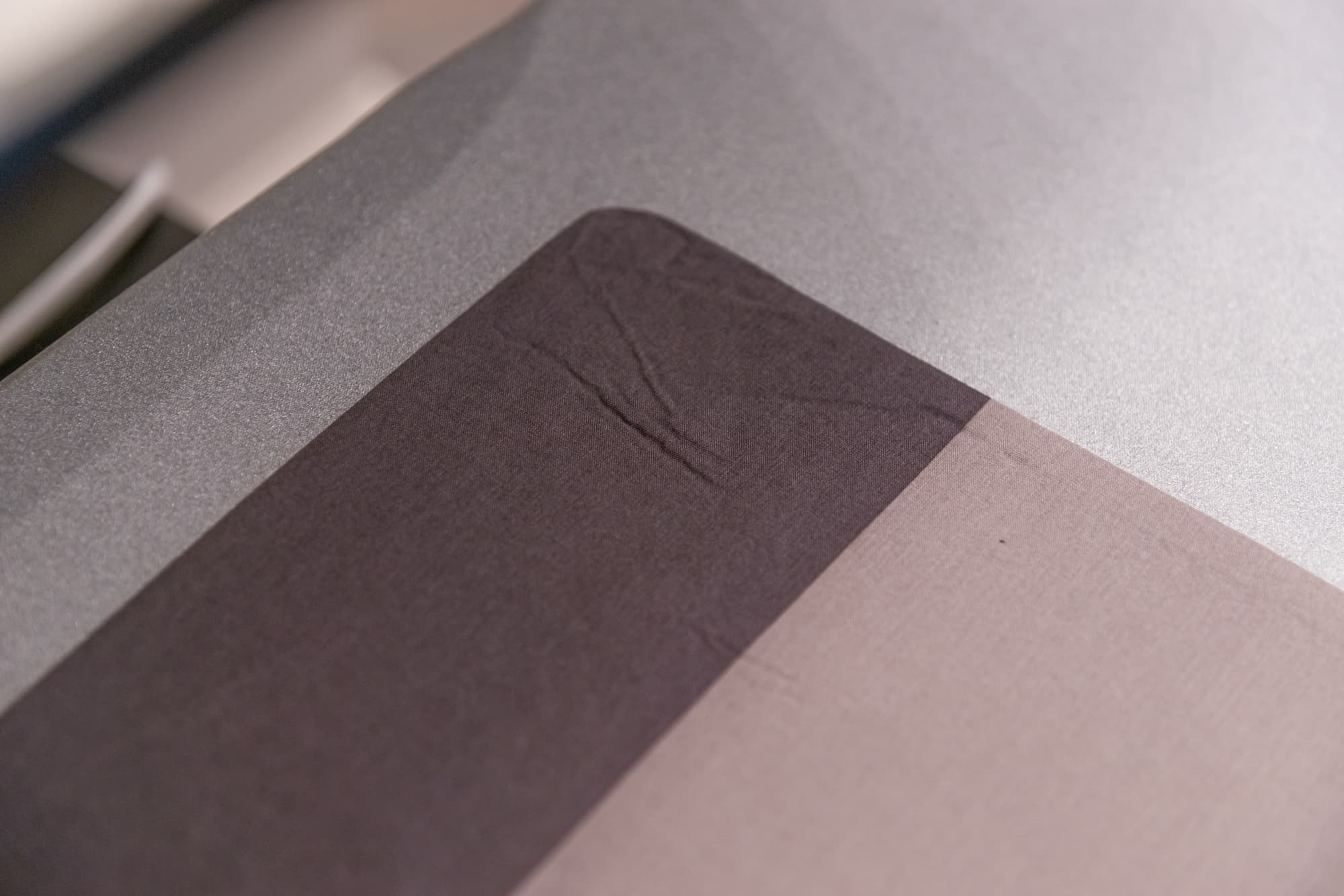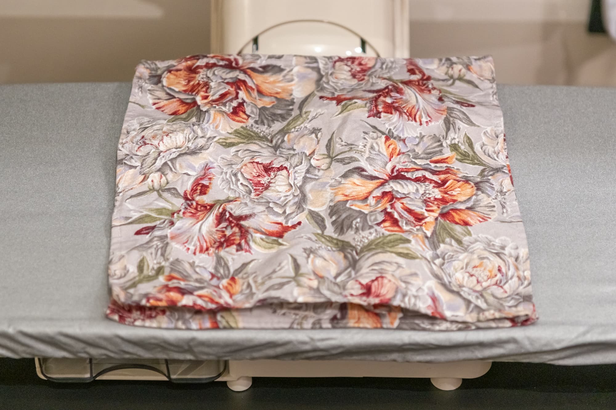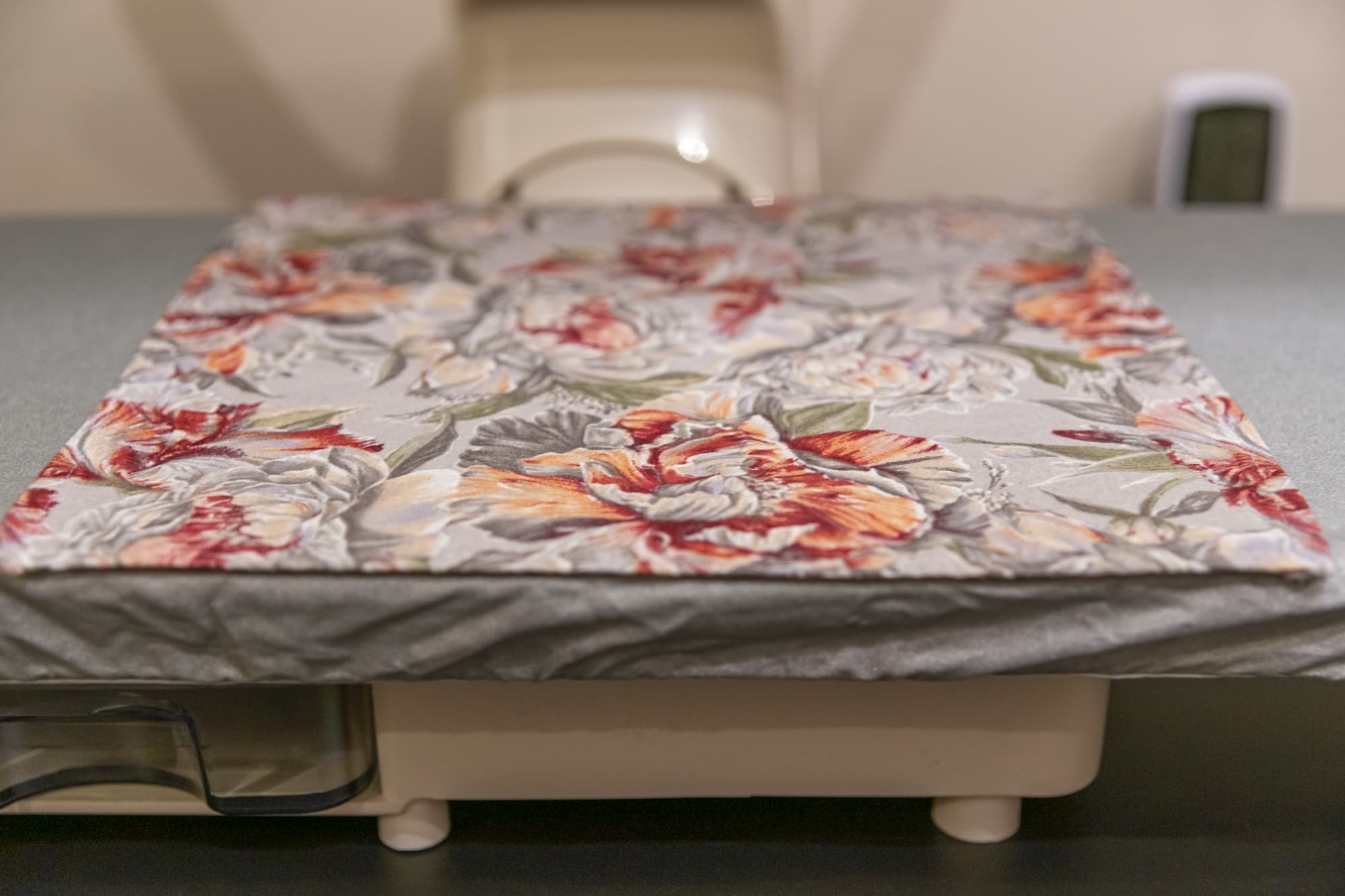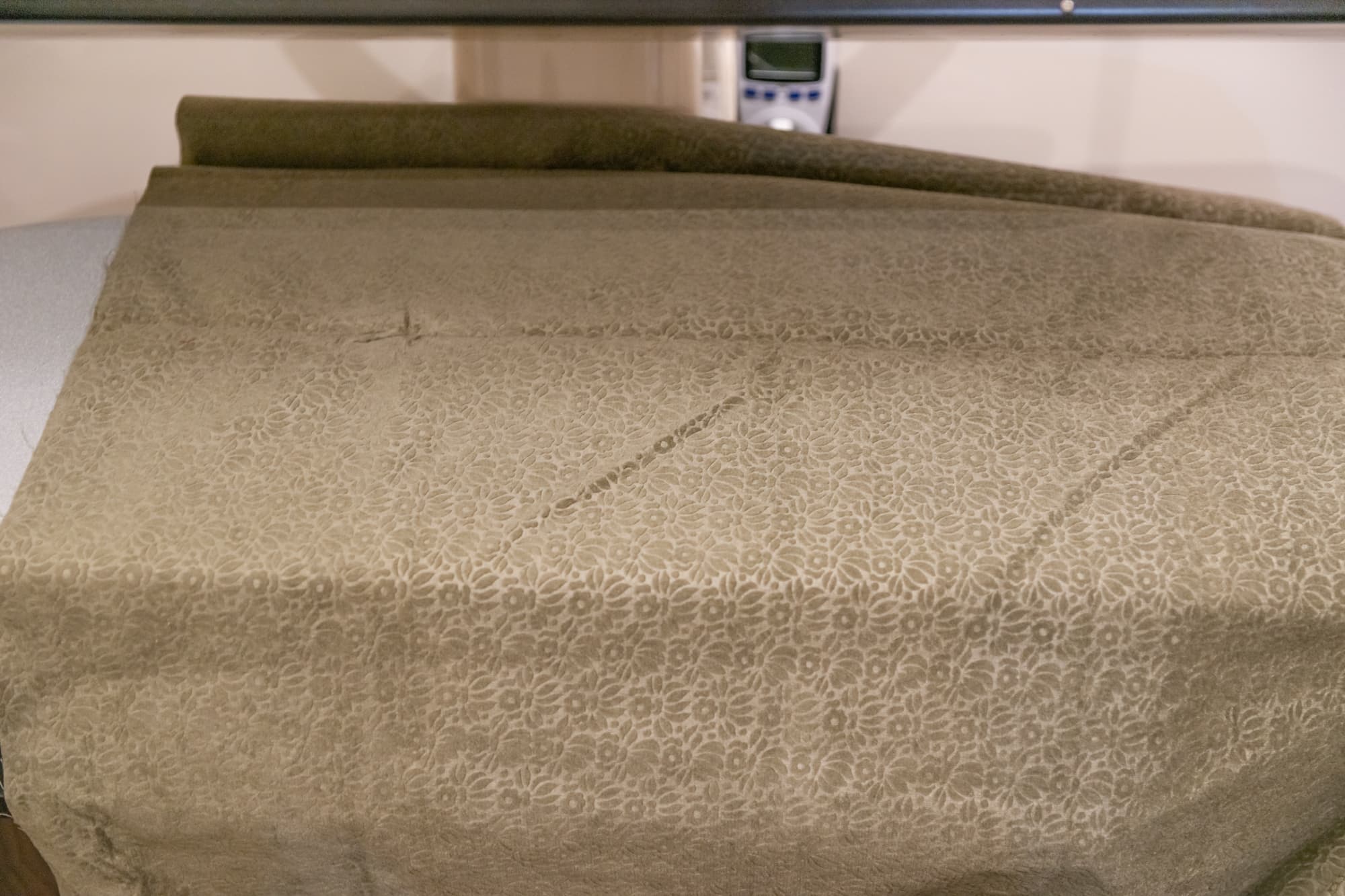 Плотная тяжелая портьерная ткань с тиснением давно лежала в сложенном виде и местами приобрела заломы. Обработку паром мы сочетали с придавливанием панелью, нагретой на максимальной температуре в режиме Linen. Пара движений прессом по одному и тому же месту позволили разгладить почти все серьезные замятия, оставив лишь небольшие складки.