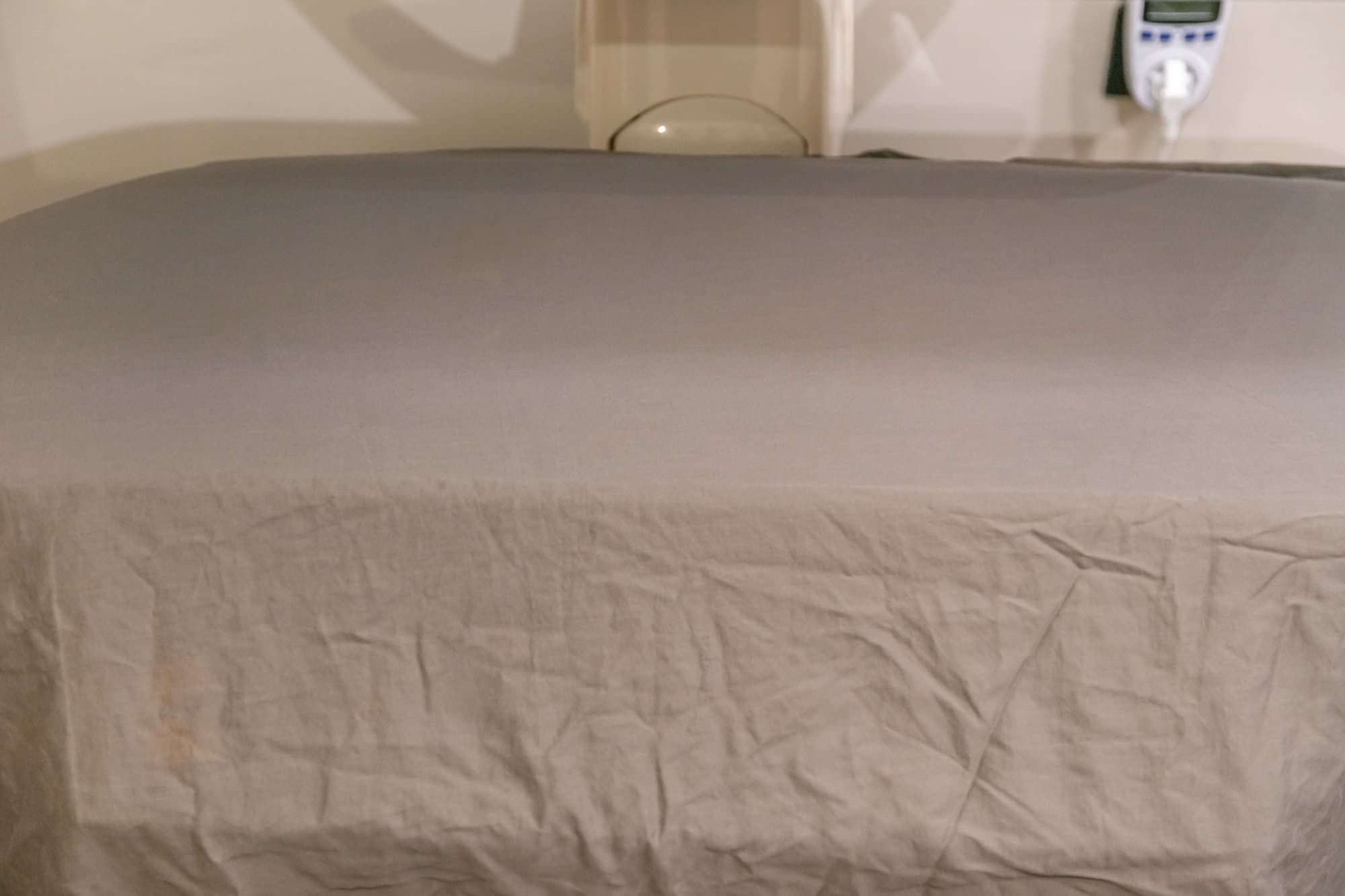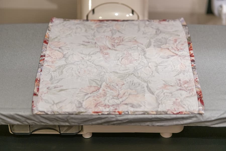 Простынь обрабатывалась сложенной вдвое, но наше изделие было на резинке, поэтому края мы раскладывали в один слой, натягивая резинку на один край доски. С простыней без резинки было бы намного проще и быстрее.