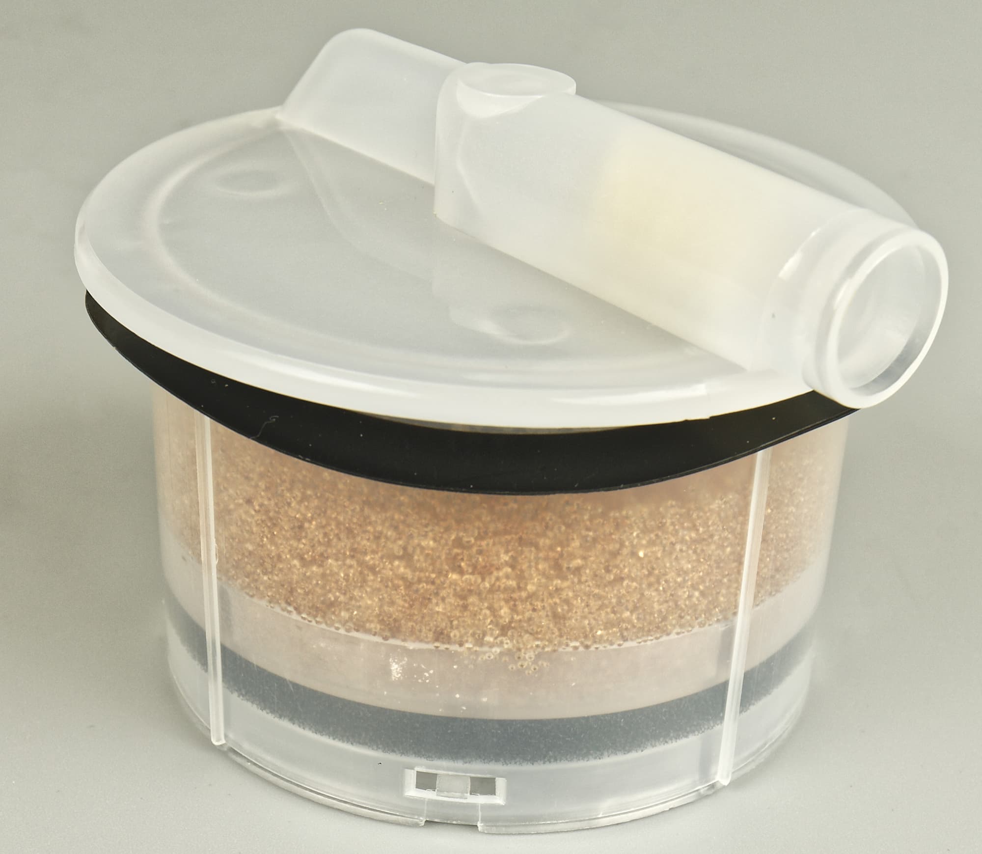 Фильтр в виде пластикового контейнера с гранулированным наполнением, как утверждает инструкция, содержит ионообменные смолы призванные снижать содержание соли, магния и кальция в воде путем их замещения ионами натрия, делая воду таким образом мягче.