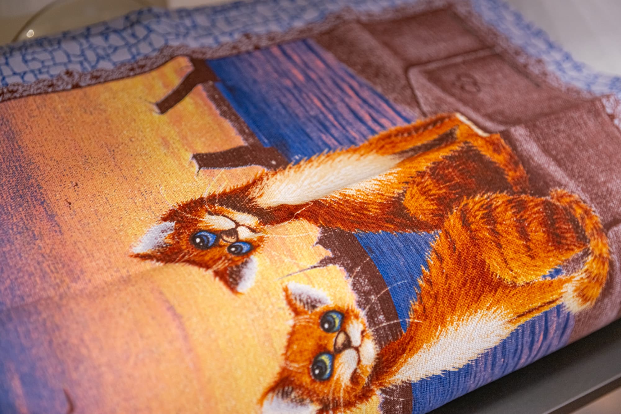 Полотенца долго лежали в шкафу в сложенном виде и имели характерные заломы, обычно трудно поддающиеся разглаживанию. Для того чтобы избавиться от них, нам понадобилось ровно два прижимания панелью, нагретой до максимальной температуры с предварительной подачей пара. Складок не осталось, краска на ткани не пострадала.