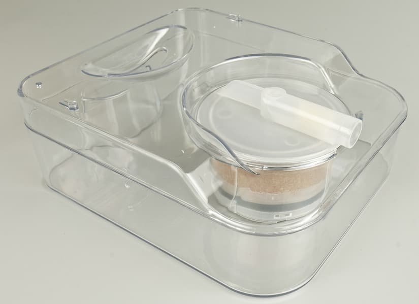 Процесс эксплуатации Kitfort KT-2607 оказался прост, абсолютно понятен и удобен. Мы установили пресс на стол, перед началом работы заполнили водой резервуар, поместили в него минеральный фильтр, установили контейнер в положенное место и подключили прибор к сети. Отметки о максимальном объеме воды на резервуаре нет, поэтому, мы использовали мерный стакан. В емкость можно заливать до 0,7 л воды. Если она будет дистиллированной, функциональность умягчающего картриджа останется невостребованной.