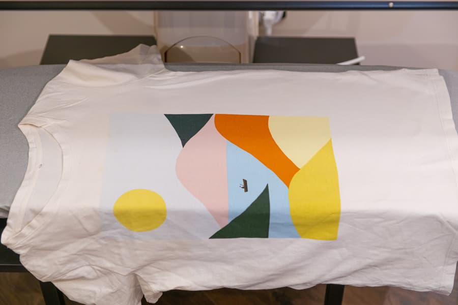 Хлопчатобумажная футболка с принтом обрабатывалась тоже на режиме Cotton и тоже с паром. К нагревающейся панели изделие лежало лицом.